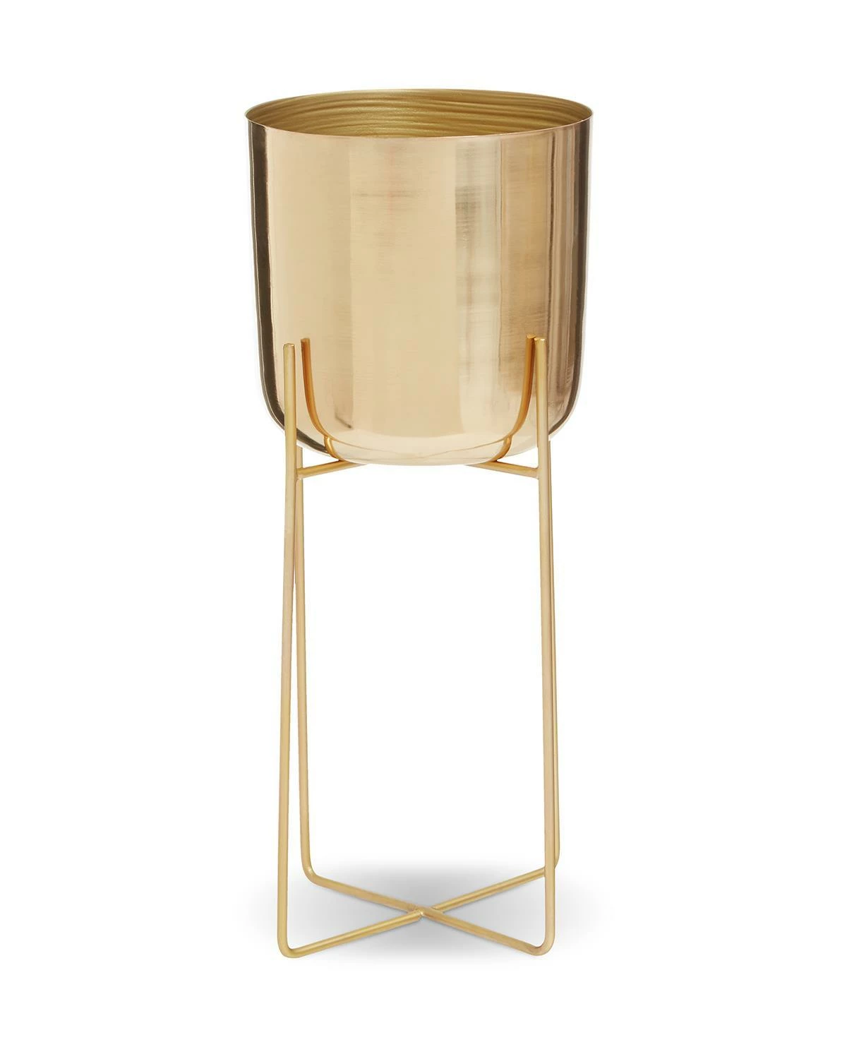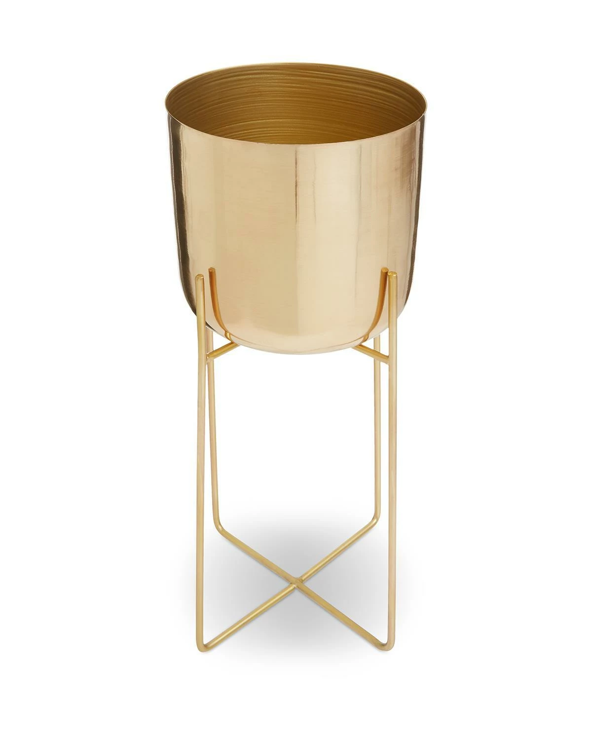 The round floor standing planter in a warm metallic finish adds a touch of luxury to any living area or hallway. This expertly handcrafted planter is made from robust iron and sits neatly in a slim intersecting base for added support and style.