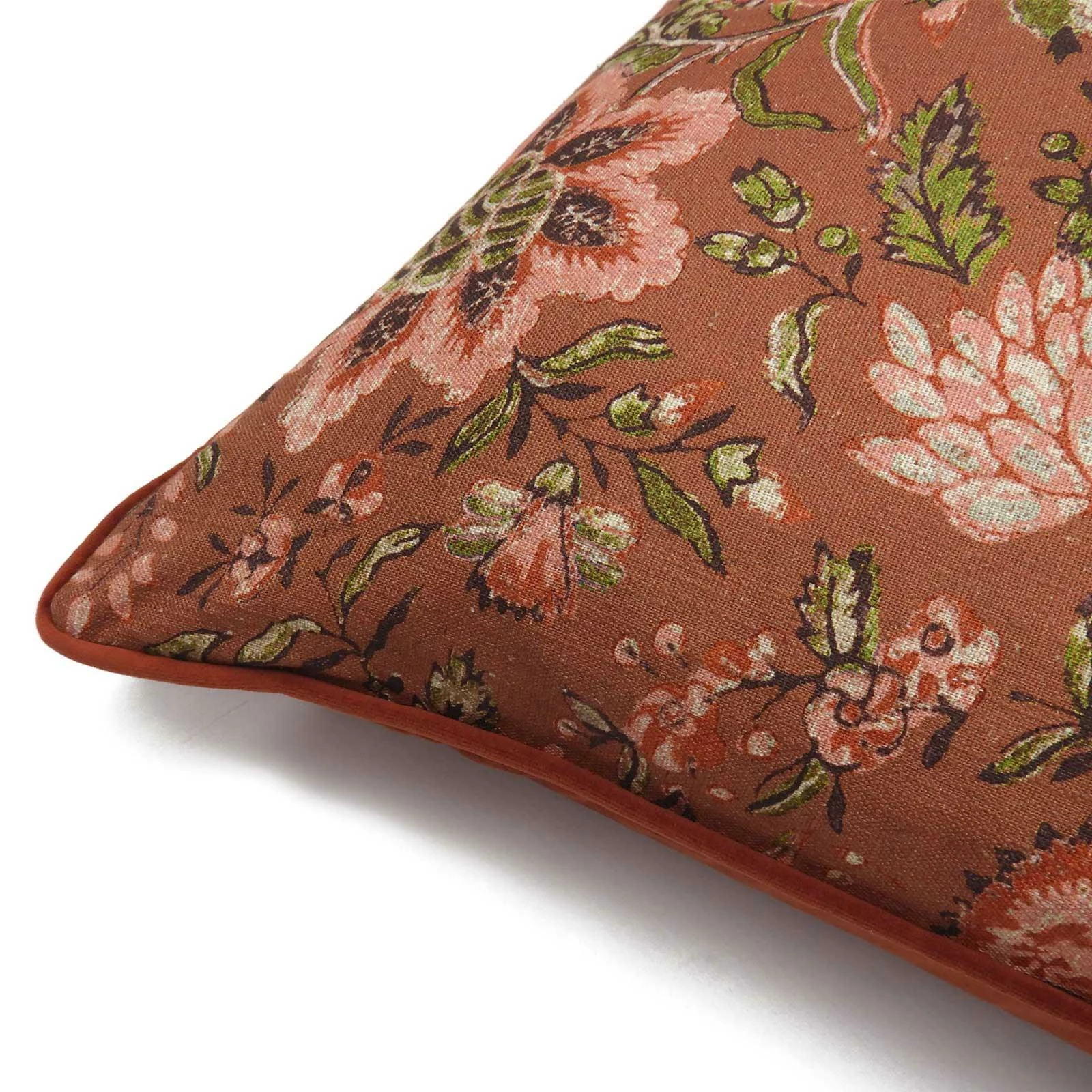 A traditional cushion cover design showcased in a warm antique rust colourway. Finished beautifully with a contrasting plain soft velvet reverse and piping. Luxurious cushions, handmade with love and pride in Staffordshire, UK.