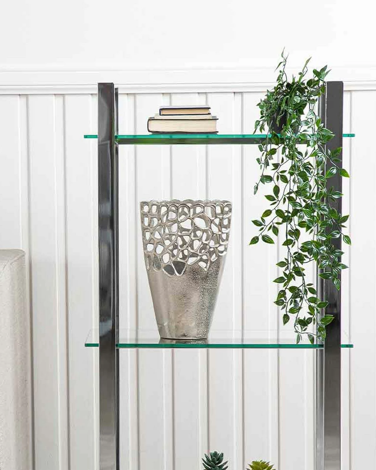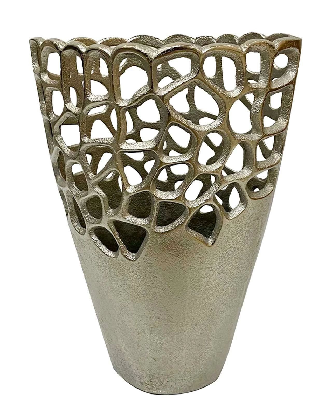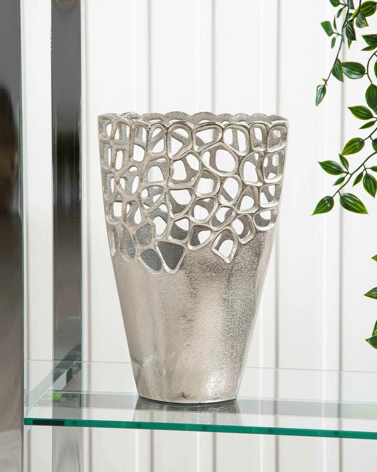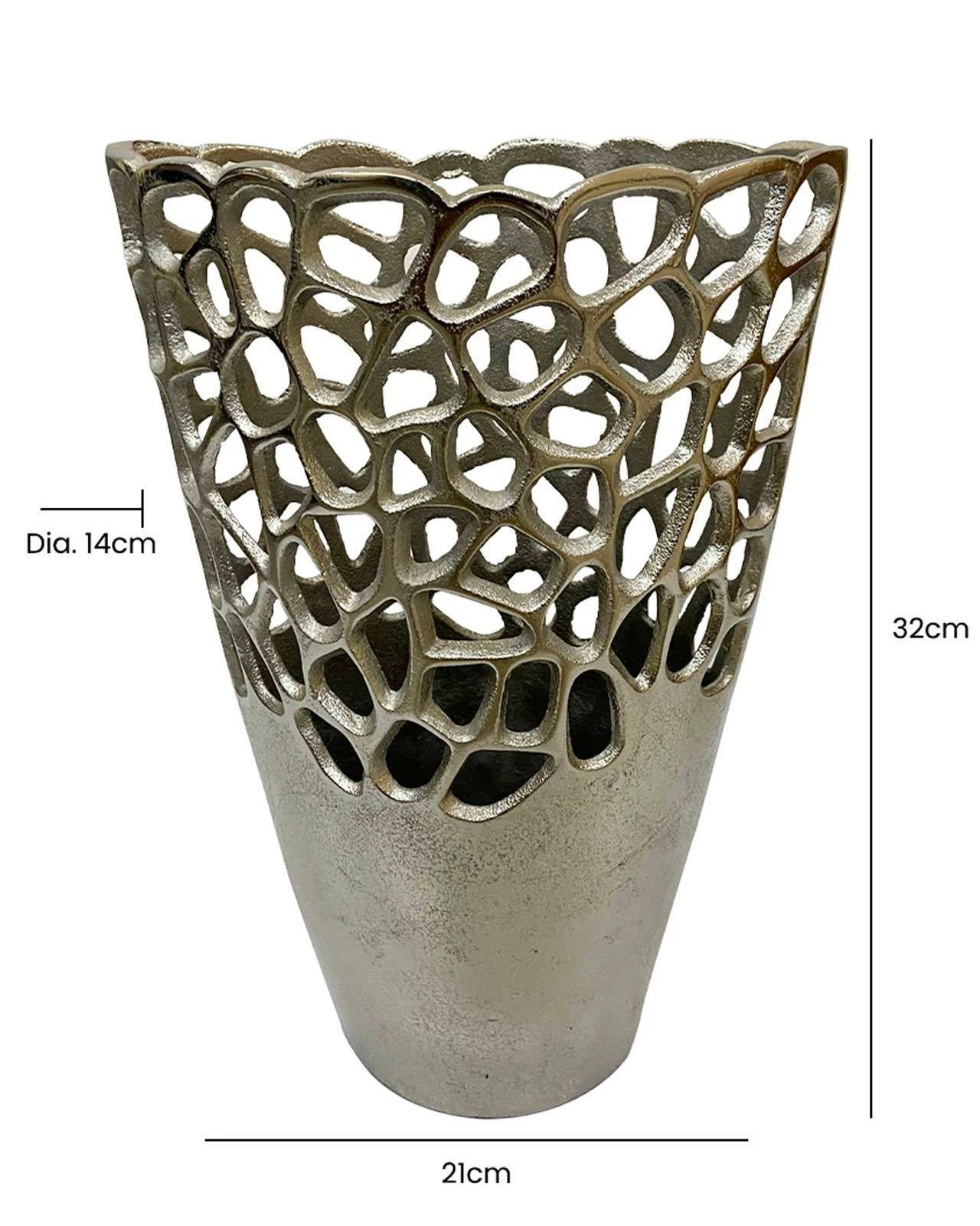 Bella is a modern and eye-catching piece that is sure to enhance any home decor. Measuring 32cm tall, this vase features a beautiful silver nickel metal finish with a unique cut out design that adds an extra touch of elegance and sophistication to the overall design. Whether displayed as a standalone decorative piece or used to hold artificial flowers or pampas, it is sure to make a statement in any room. Its unique cut-out design adds a touch of contemporary style and creates a stunning visual effect when placed in a well lit area.