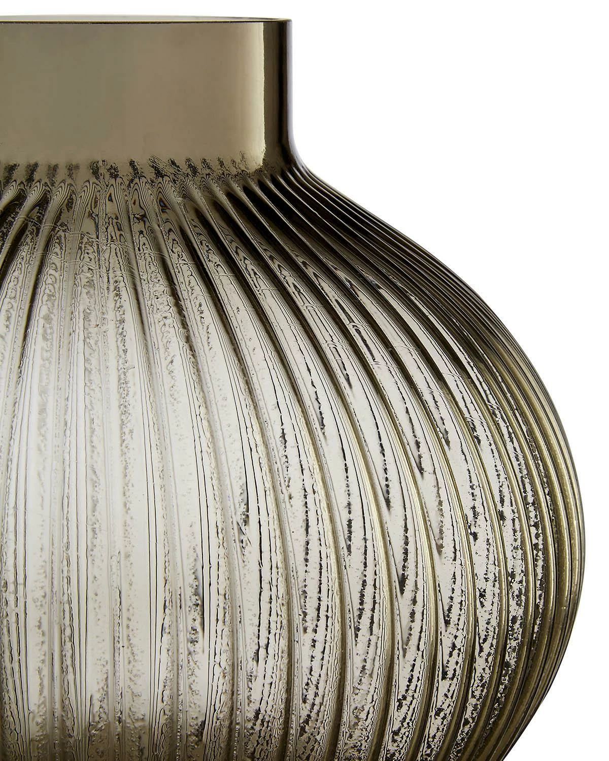 The large vase is an exquisite piece of art that is formed from glass, featuring a unique spherical design with an extruding rim. Its rounded body is corrugated, giving it a textured finish that accentuates its smooth curved form. The vase is a magnificent display piece that will add a touch of class and sophistication to any living space.