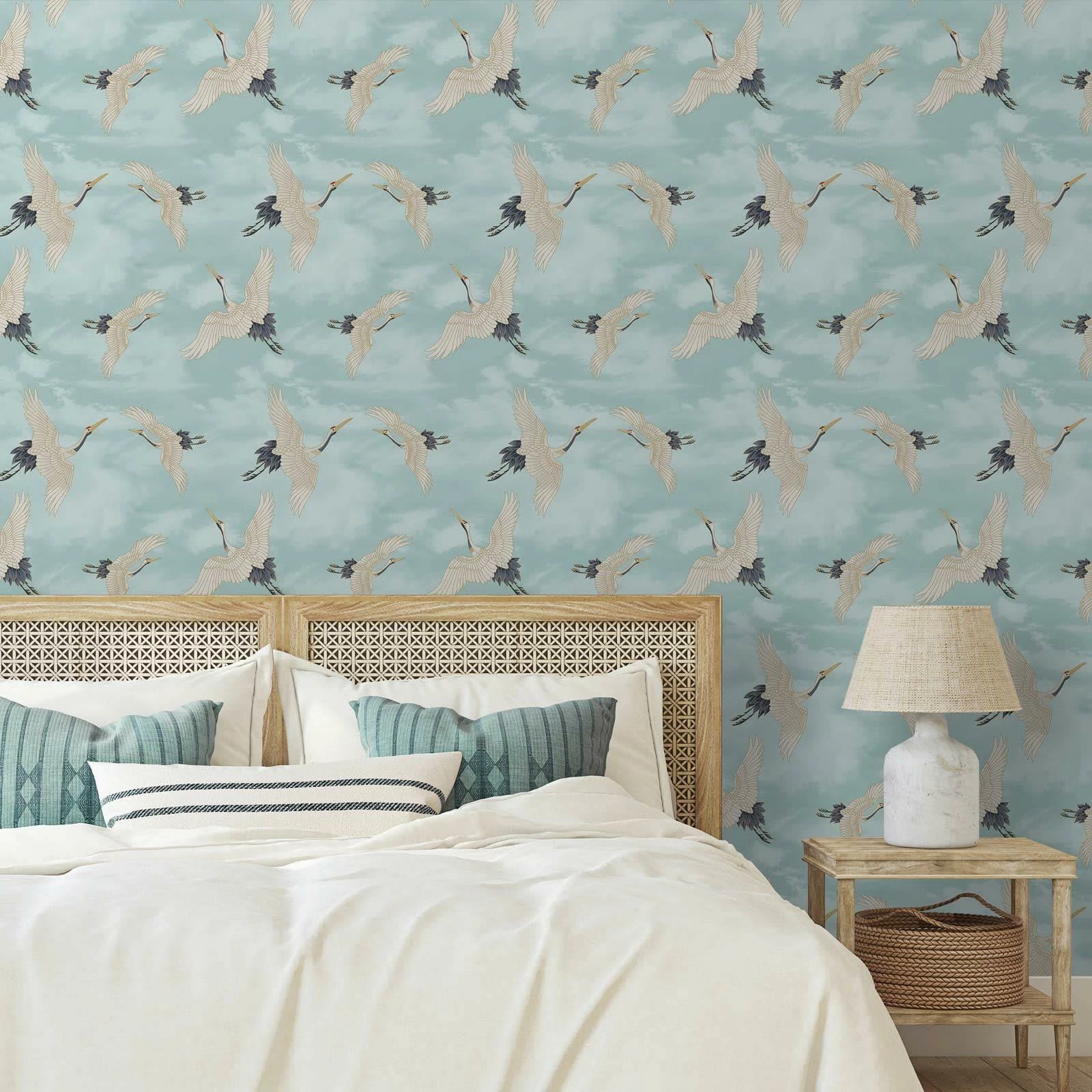 Bring the blissful beauty of the orient into your home with this statement crane wallpaper in lovely blue tones.