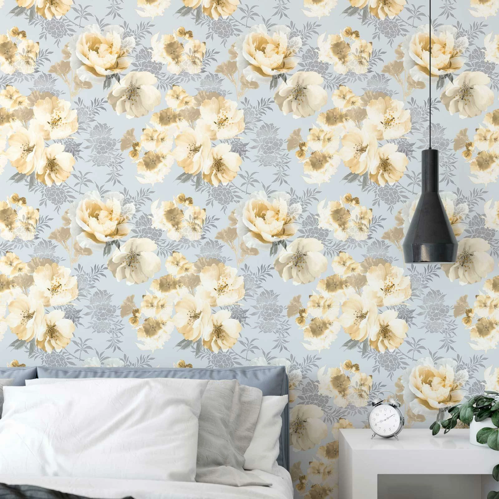 Like a still life painting, this beautiful wallpaper design features oversized Impressionist style blossoms and peonies which dramatically sit over Japanese woodblock silhouettes creating an elegant look for any living space. Ochre yellow and silver grey adds