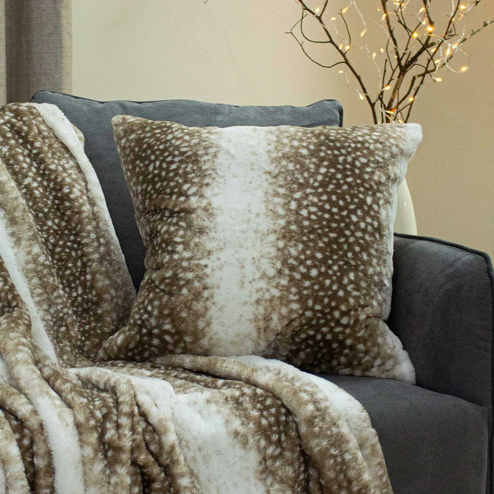 It’s time to get cosy and create a textural look at home, with the Fawn faux fur cushion, featuring a soft and tonal printed deerskin design. Accessorise alongside light and tonal colours to create warmth and a modern snug feel.