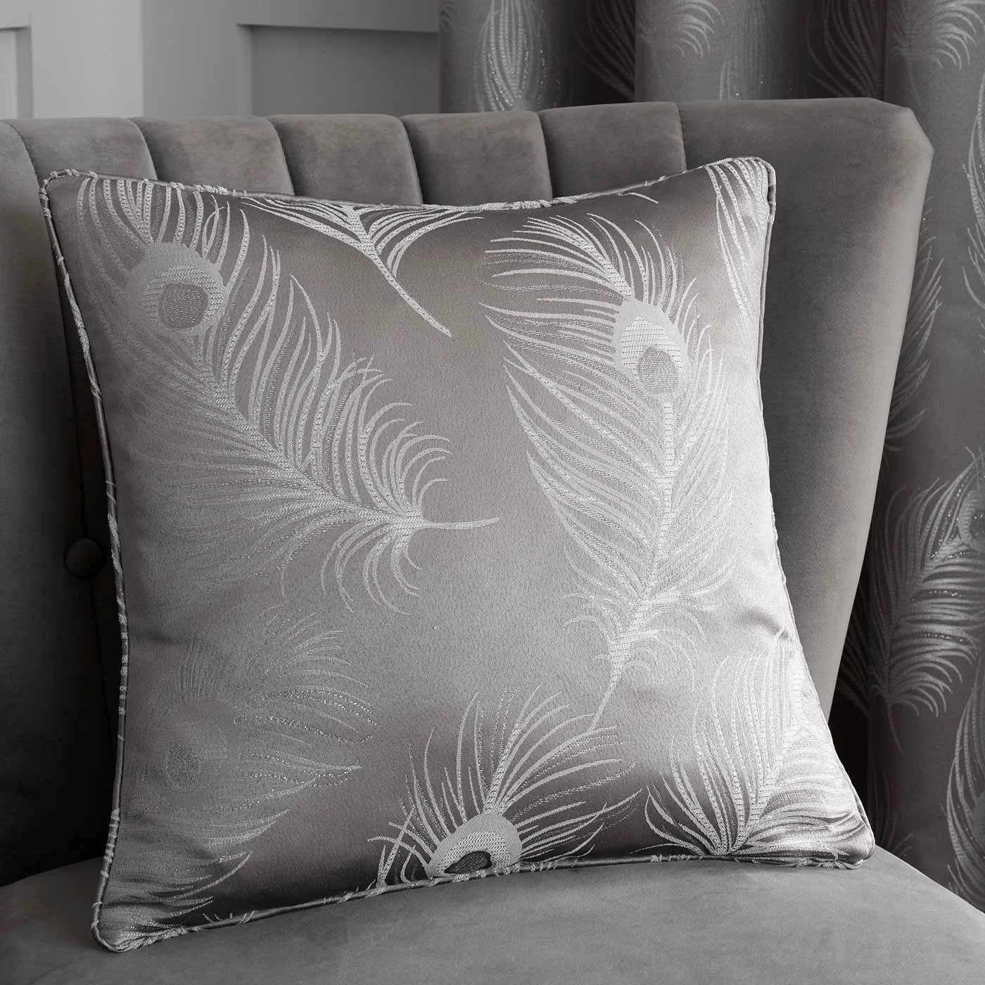 Stunning grey feather cushion covers featuring a stunning contemporary peacock feather motif design finished in luxurious jacquard fabric with stunning silver metallic detailing for depth and texture.