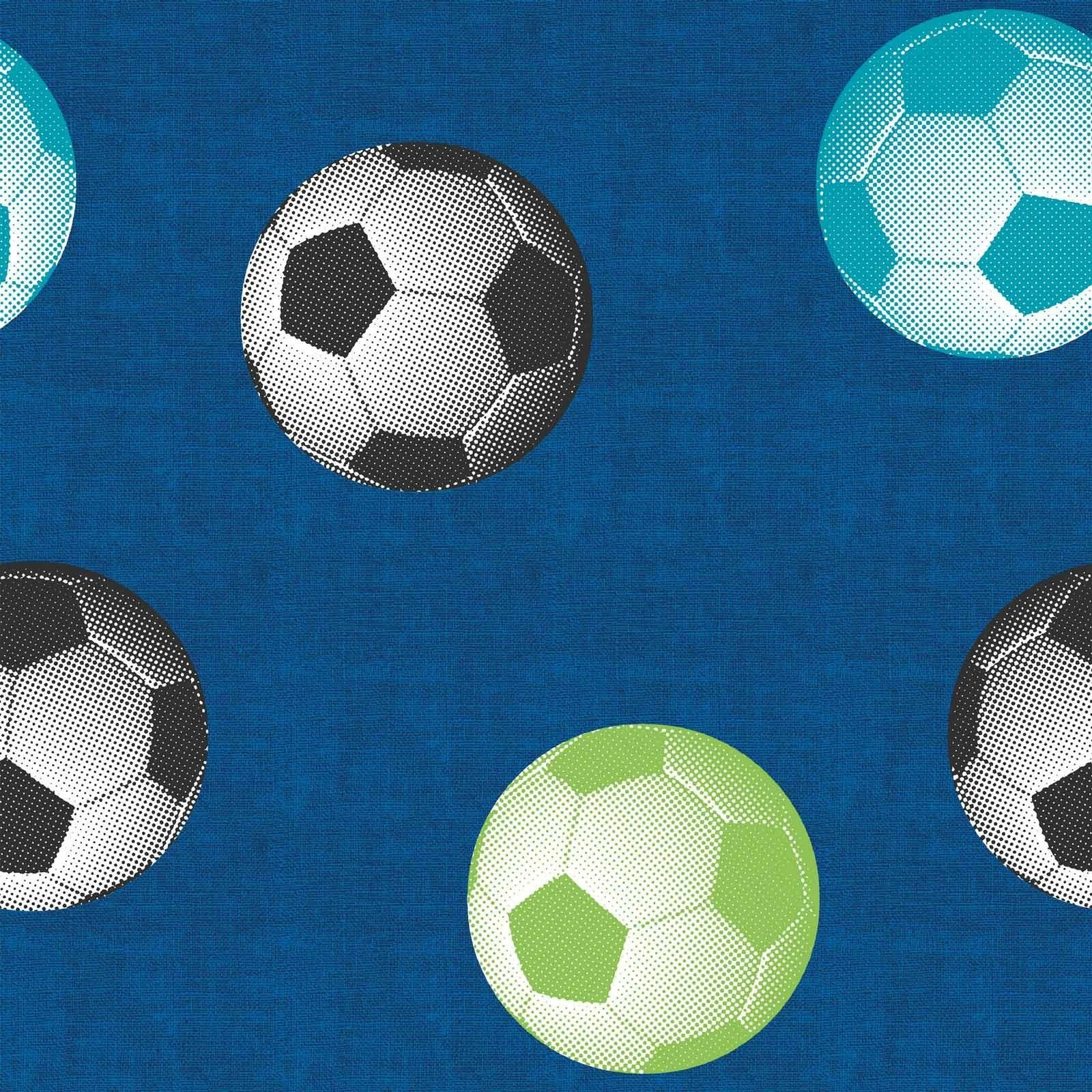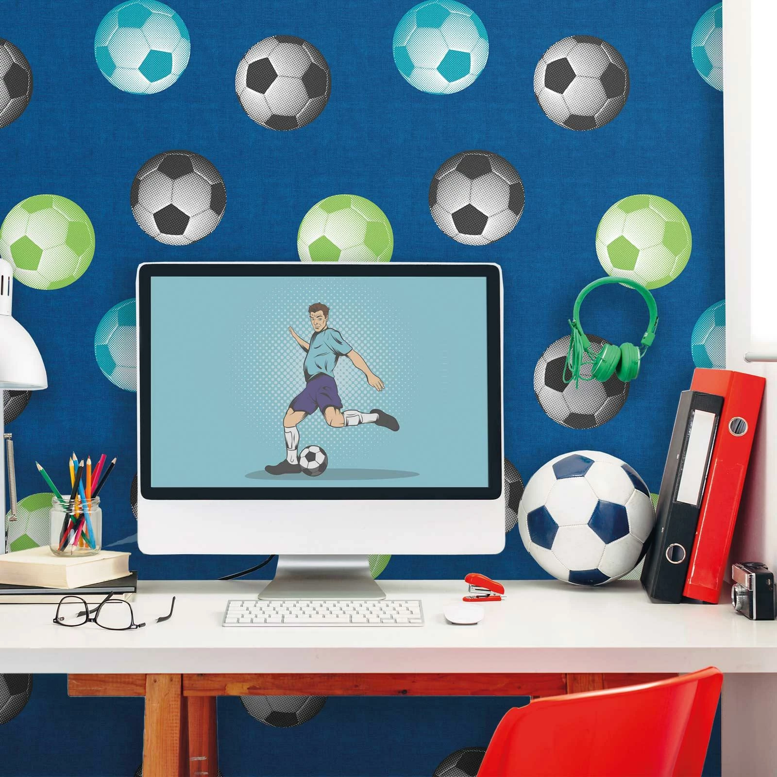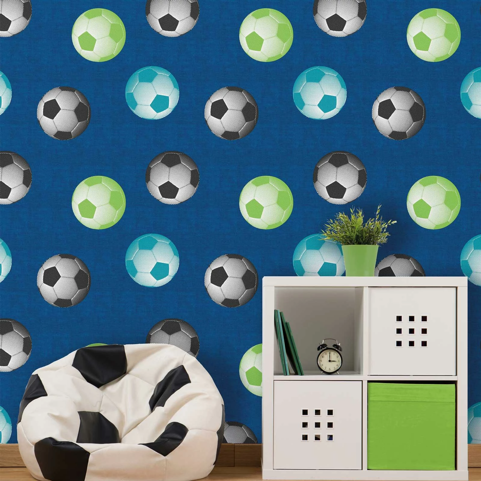 Footy mad? Transform their room into a football fan’s dream with this cool wallpaper design featuring footballs in bright shades of blue and green.