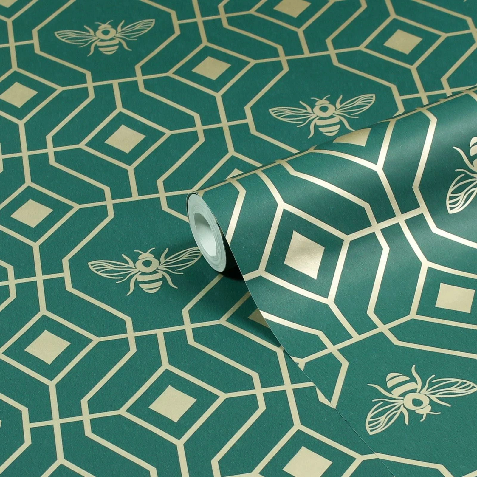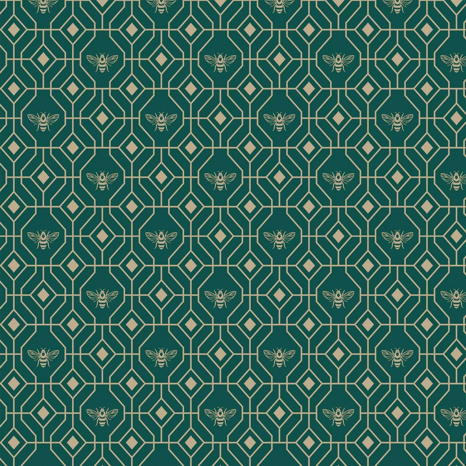 Make your boudoir buzz with the Bee Deco wallpaper featuring a honeycomb inspired geometric design completed with buzzing bumble bees. A rich emerald green hue sits behind metallic gold foil, bringing a contemporary and moody colour scheme into your home. This wallpaper is a paste-the-wall application – simply paste the wall, hang your paper, and leave to dry. Each roll is 10.5m long and 53cm wide. Our Bee Deco wallpaper can be used to paper the whole room or to create an eye-catching feature wall.