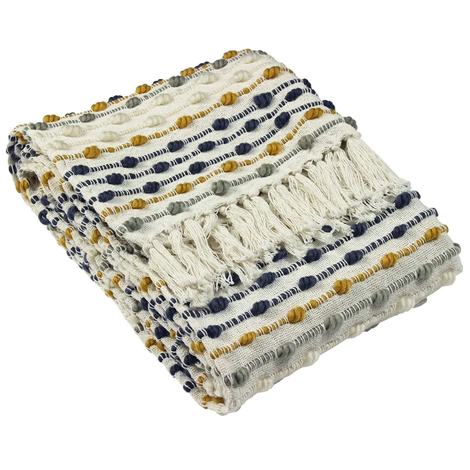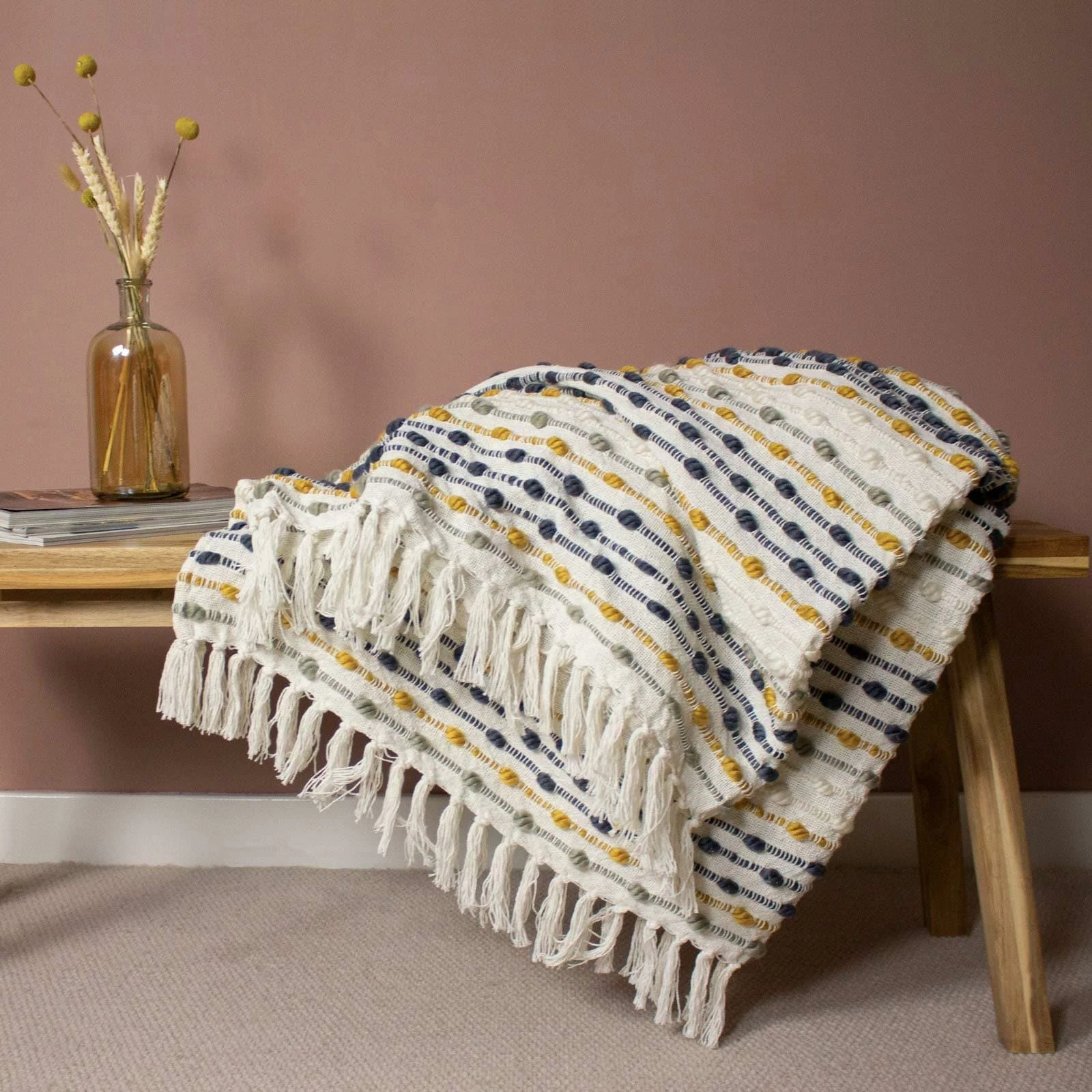 - Featuring a chunky woven tuft stripe and dotted design complete with fringe tassel edging