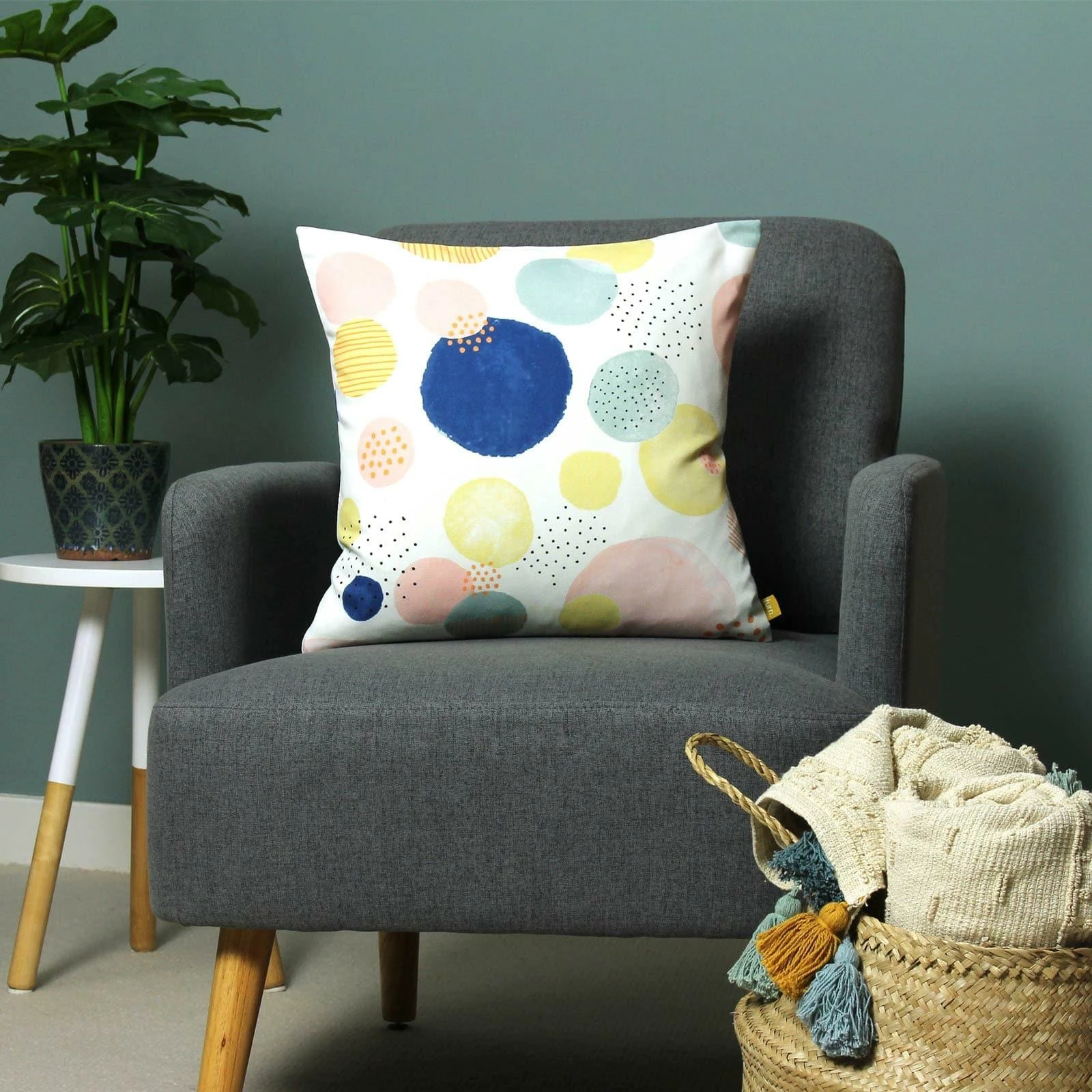 Add global styles and a pop of colour to your interior with this vibrant geometric printed cushion cover complete with circles and polka dots. Layer up on neutrals and place on any chair or bed to make a statement in your modern or contemporary interior. Designed, printed and made in the UK.