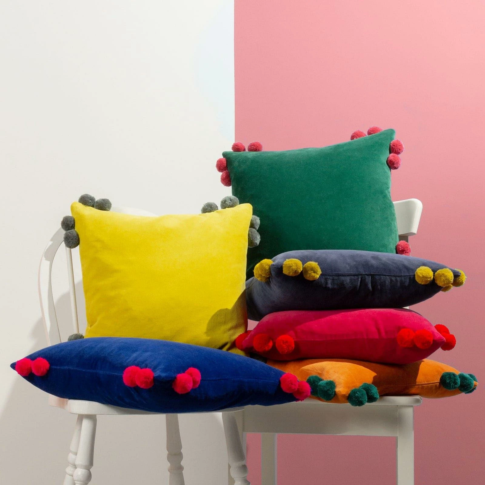 - A plain cushion design featuring fun bold cotton pom poms available in a range of colour ways