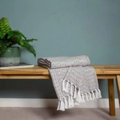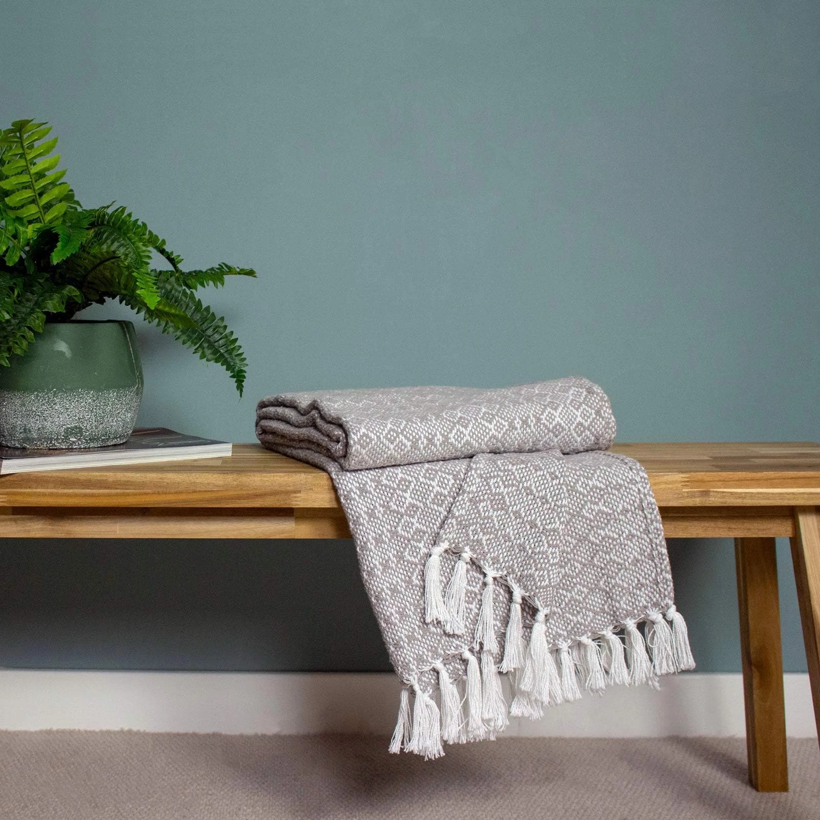 Perfect for summer styling, our Jewels woven throw in warm grey is great for cooler summer evenings in the garden or on the terrace. Made with durable and breathable cotton, the grey mini geometric woven design is reminiscent of angular jewels. Fringed edges on two sides gives additional texture to this versatile throw.