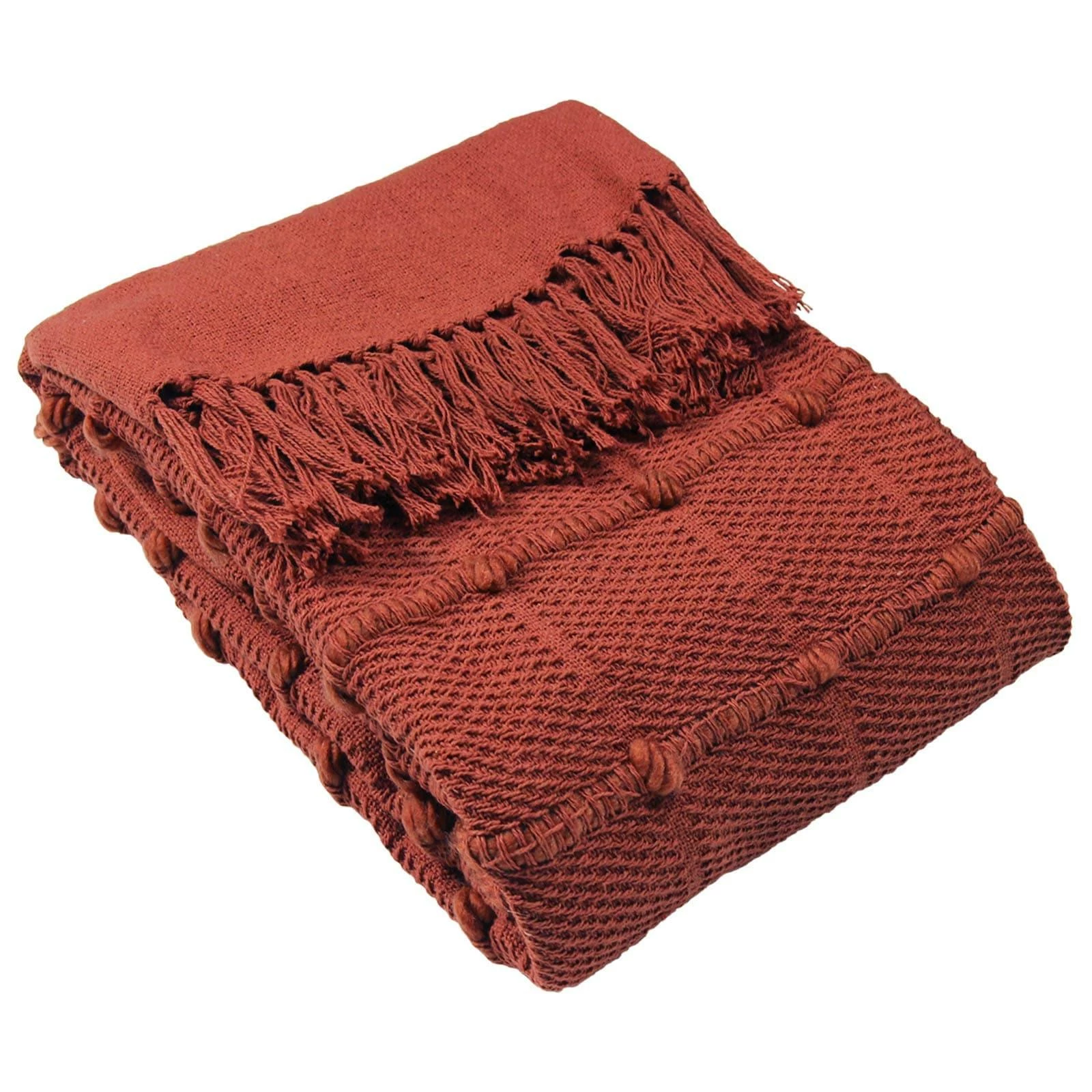 Add some texture and colour to your home with our warm red Motti cotton throw featuring a linear woven yarn stitch made from recycled PET, creating an overall subtle grid design. Perfect for summer styling or all year round colour blocking. Finished with a knotted tassel trim on two sides, this throw will fit in any room!