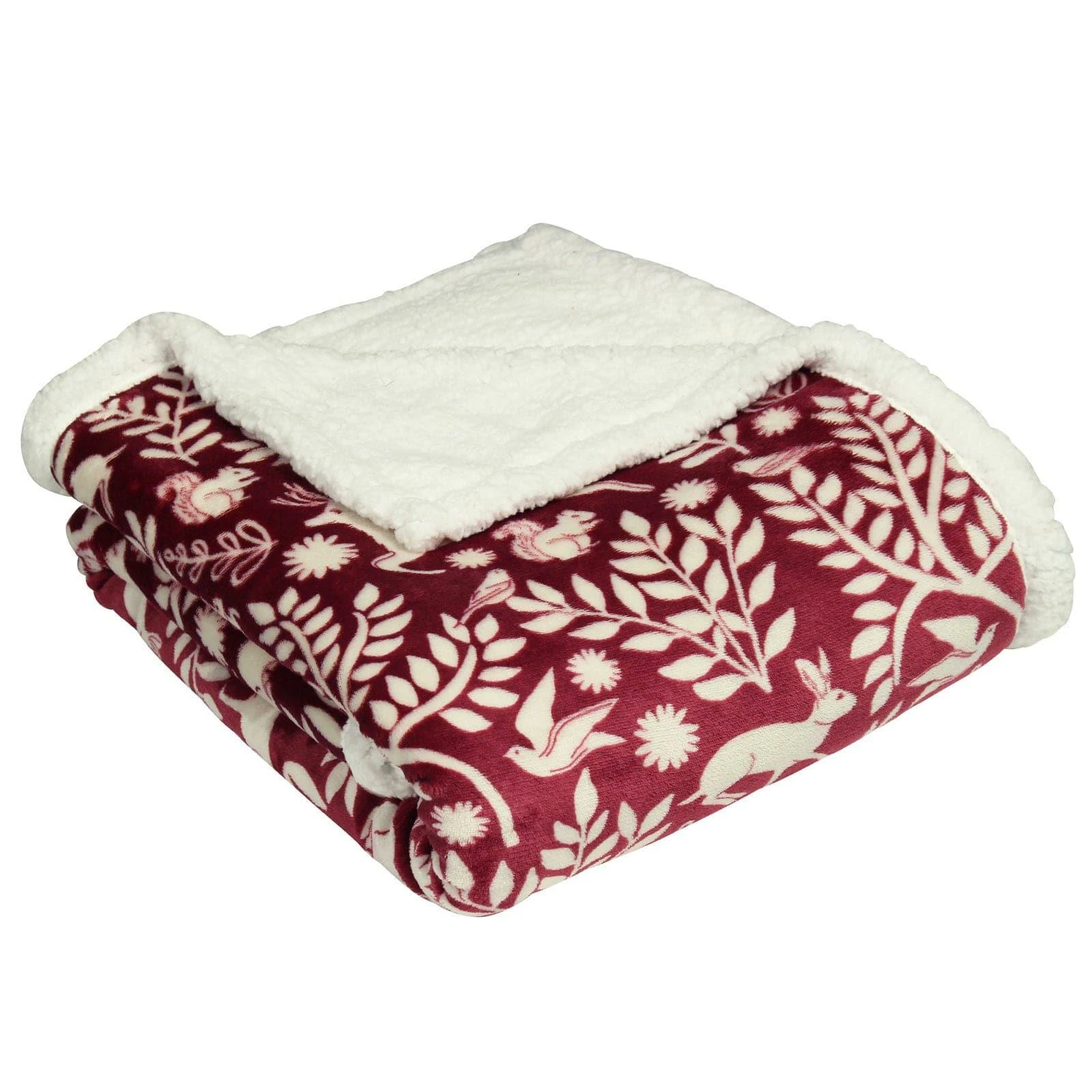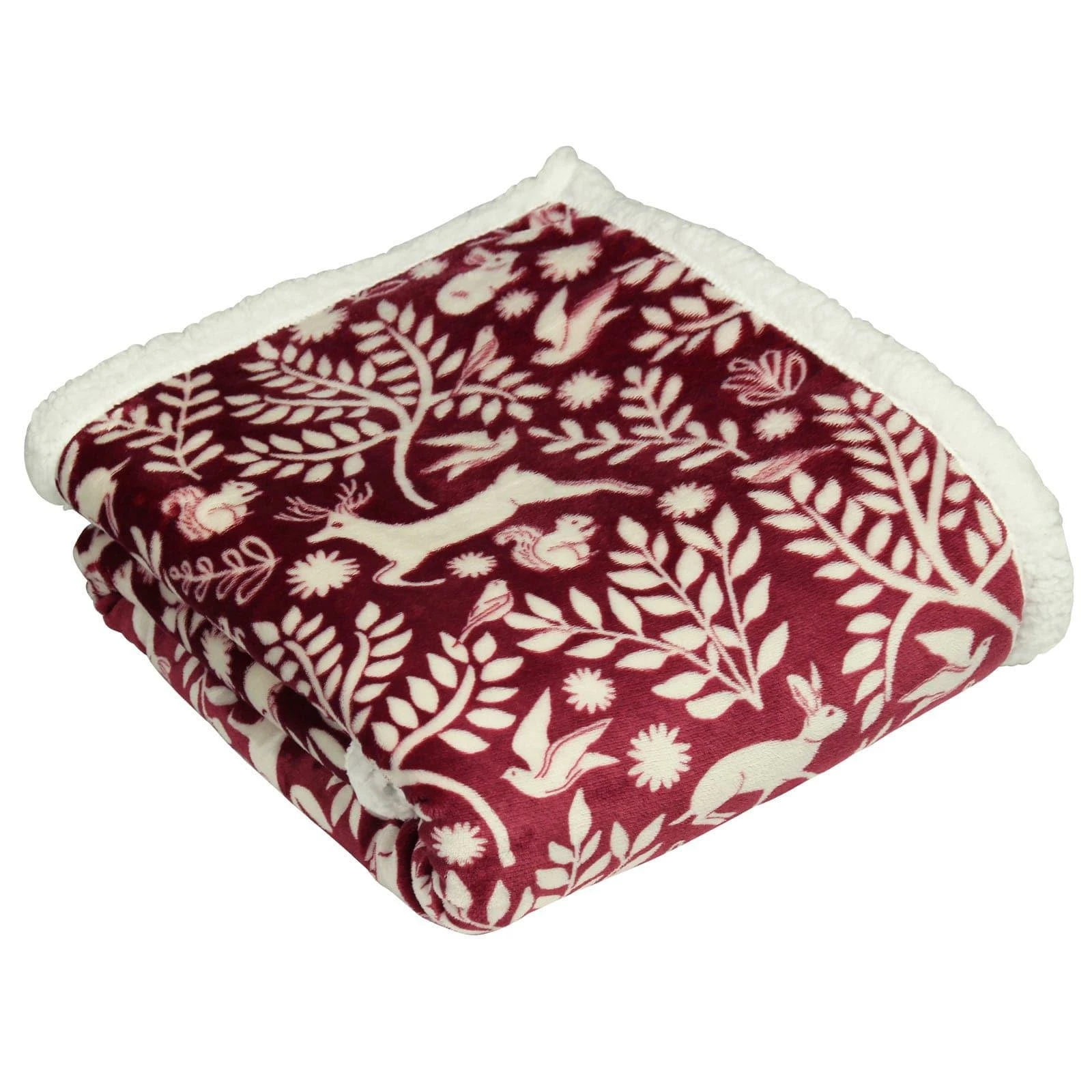 - Featuring a berry red Scandinavian woodland design with a sherpa fleece reverse