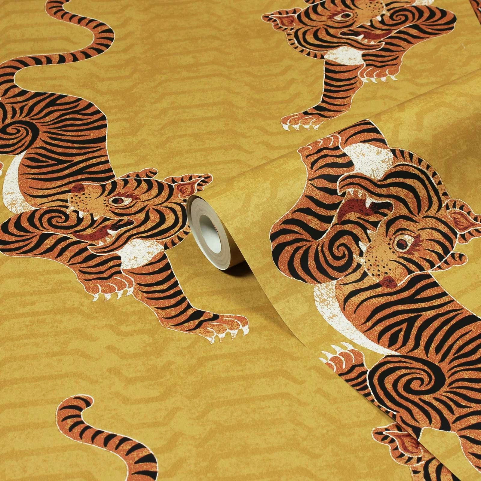 Add instant personality into your home with this showstopping Tibetan Tiger wallpaper featuring a tribal inspired design and crawling tigers. The striking orange tiger contrasts on a bold mustard backdrop, adding dimension and flair to this beautiful wallpaper. This wallpaper is a paste-the-wall application; simply paste the wall, hang your paper, and leave it to dry. Each roll is 10.5m long and 53cm wide. Our Tibetan Tiger wallpaper can be used to paper the whole room or to create an eye-catching feature wall.