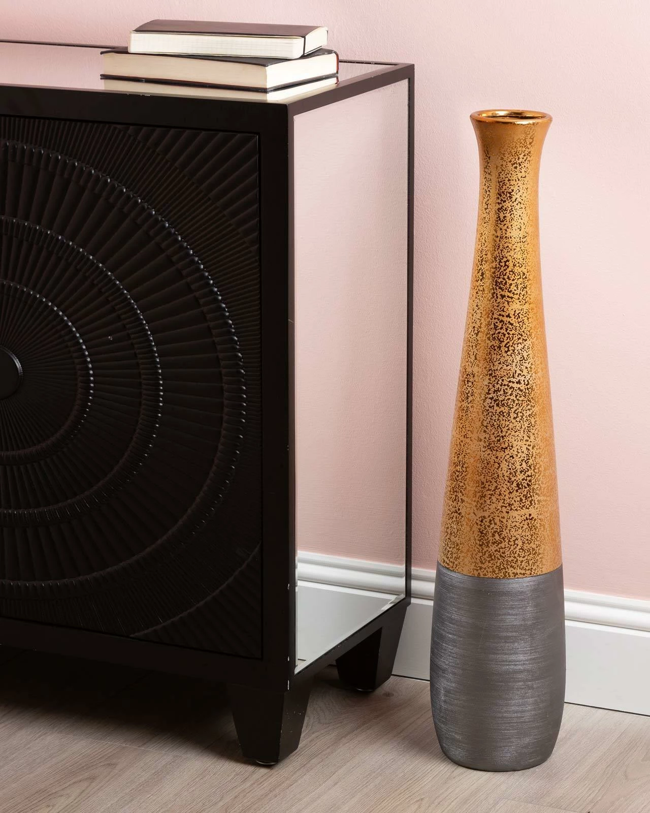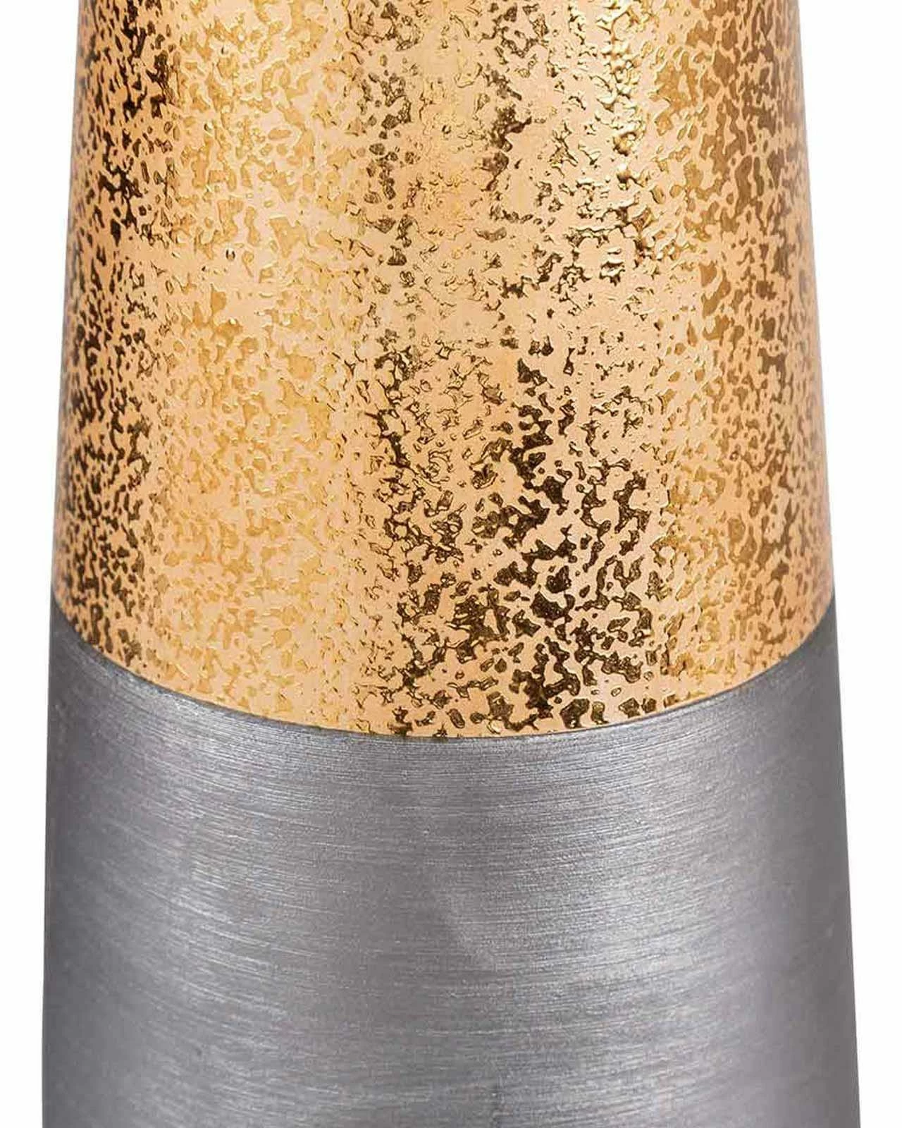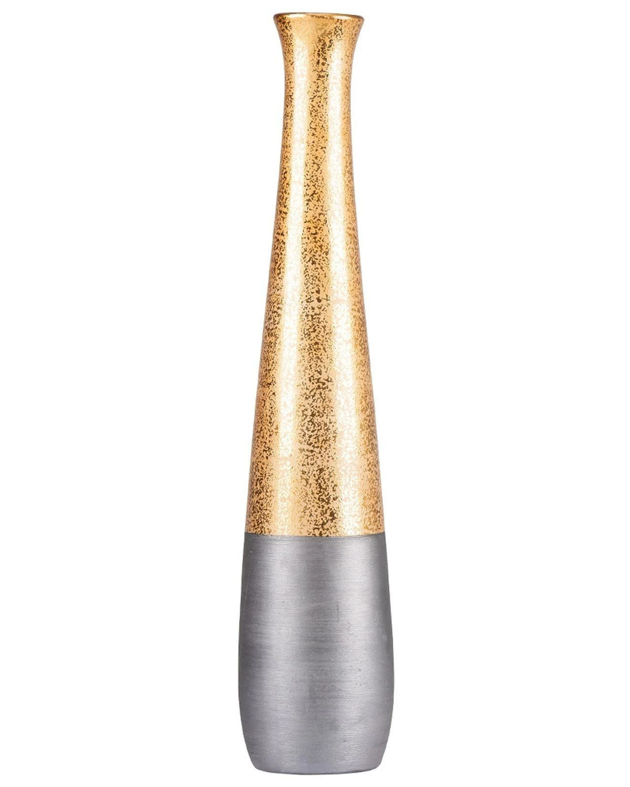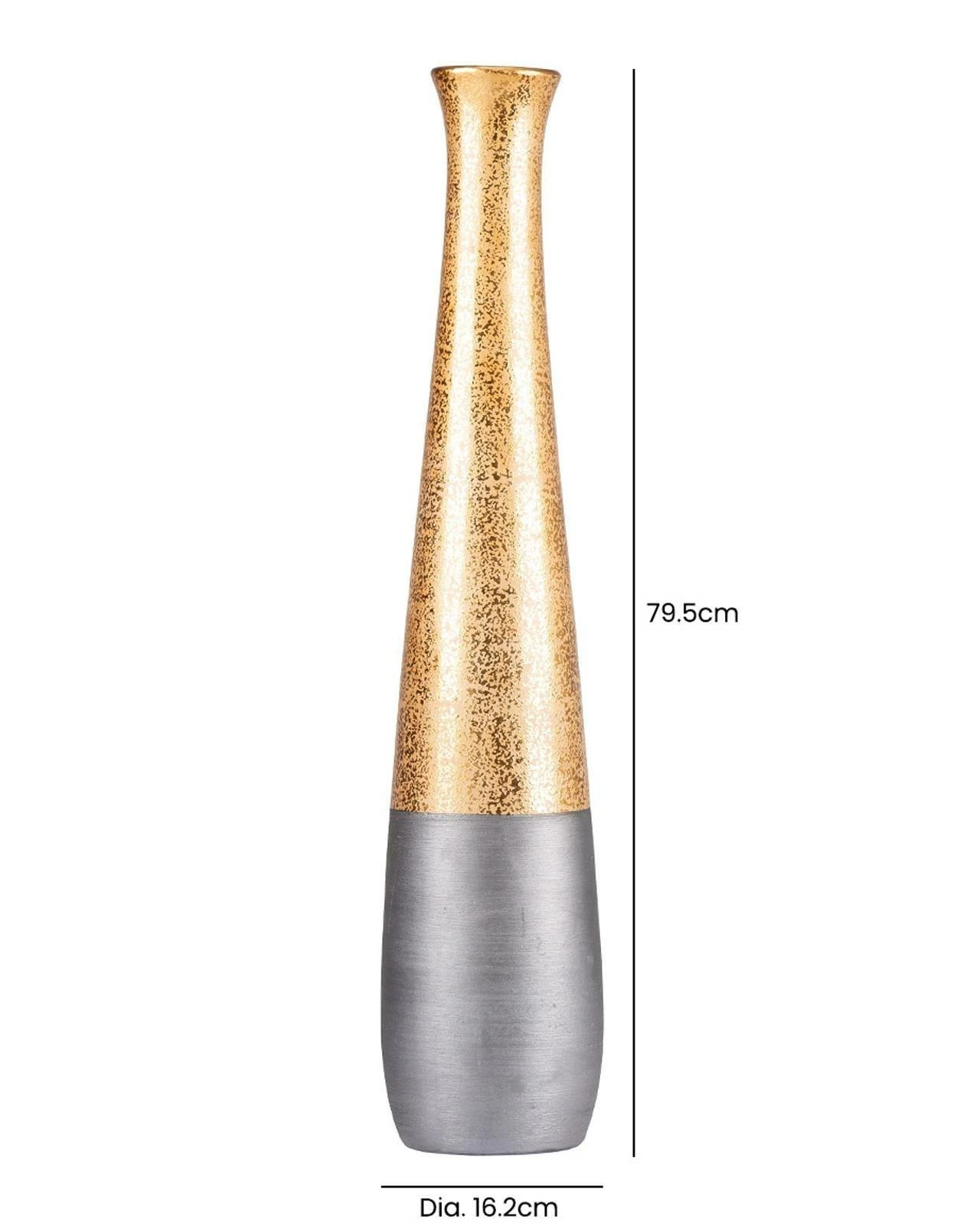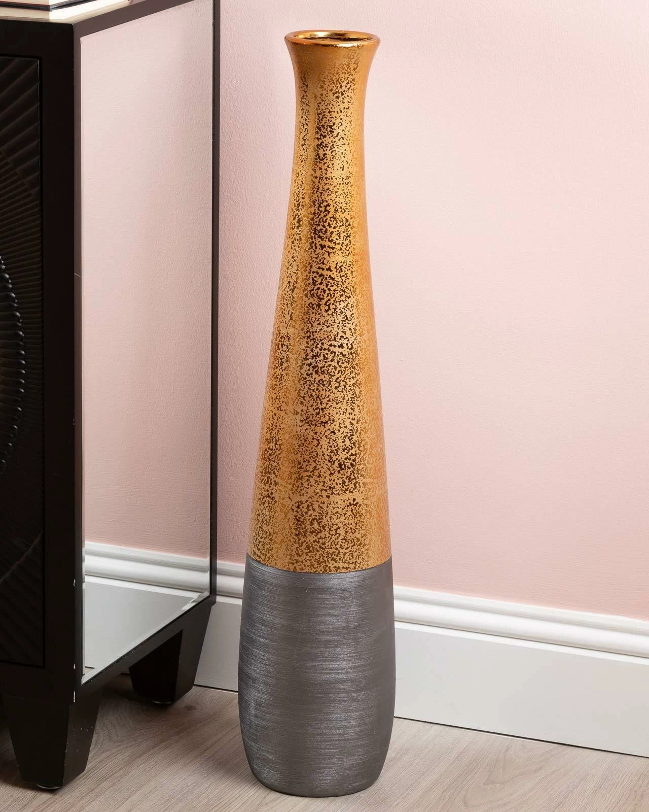 This Gaia floor vase is a stunning and sophisticated piece that will add a touch of opulence to any interior decor. Measuring just under 80cm tall, it boasts a sleek and elegantly shaped design that features a beautiful gold and black textured pattern. Whether displayed on its own or with a stunning floral arrangement, it is sure to make a statement. Its unique design and on trend colour combination make it a perfect choice for adding a touch of luxury and sophistication to any interior decor. This vase is perfect for displaying in a corner or as a centrepiece in your living room.