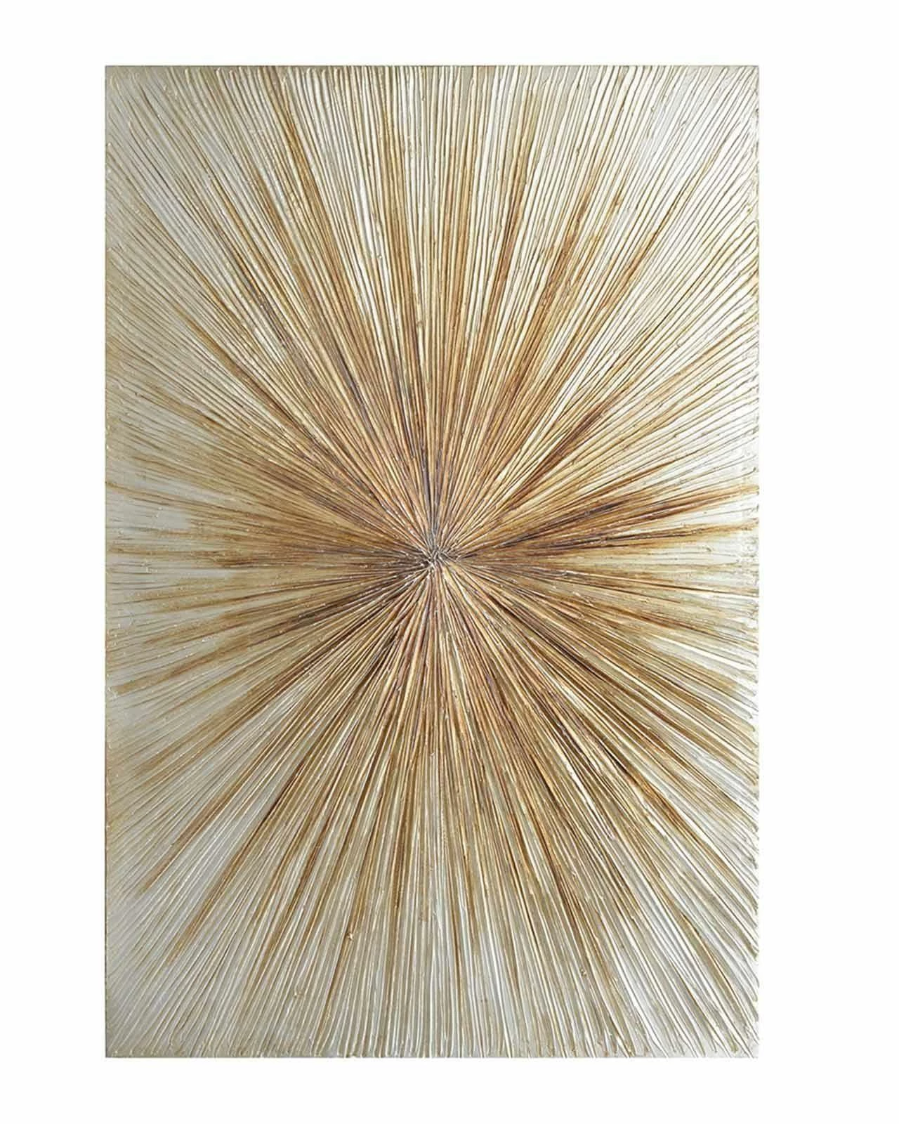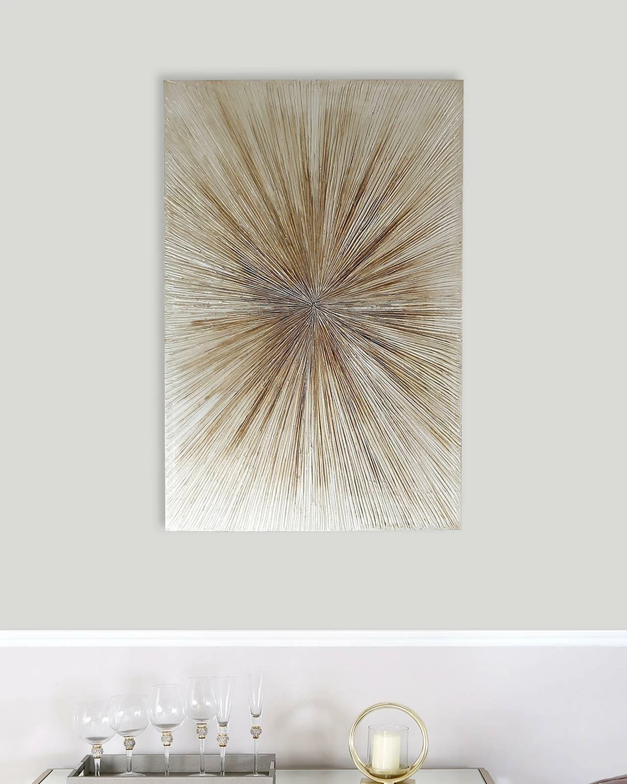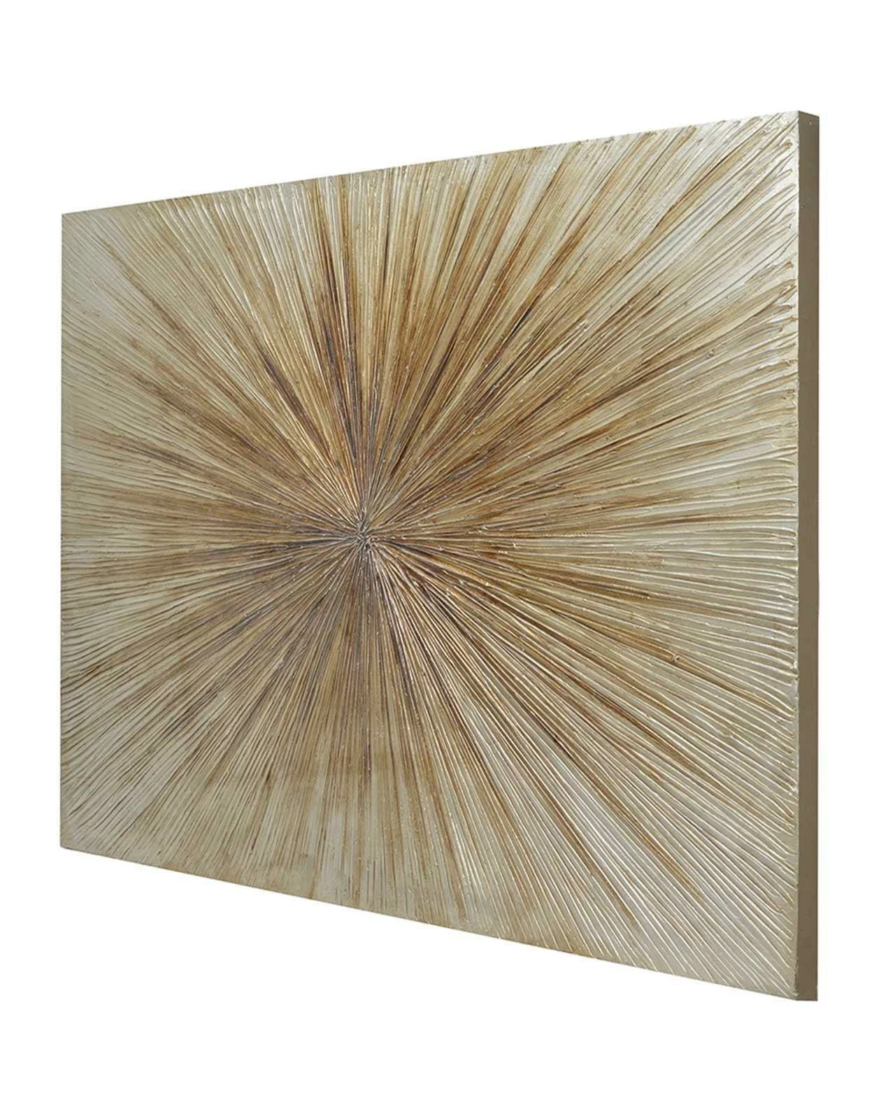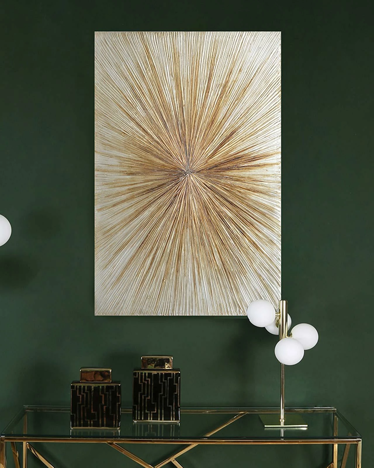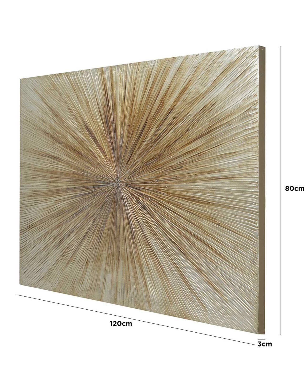Introducing this large gold starburst canvas, a stunning artwork that will transform any space into a modern and sophisticated oasis. Measuring 120cm either in height or width, this canvas is large enough to make a bold statement while still fitting comfortably on any wall. The intricate and abstract design features a striking starburst pattern painted in luxurious gold tones. The textured finish of the canvas adds depth and dimension to the artwork, creating a mesmerising visual display that is sure to captivate and inspire. The sturdy wooden frame and durable canvas ensure that the artwork will remain in perfect condition for years to come, while the fade resistant colours ensure that the piece will retain its vibrancy over time. Add a touch of sophistication to your home with this exquisite artwork and complete your artistic vision with this beautiful and captivating canvas.