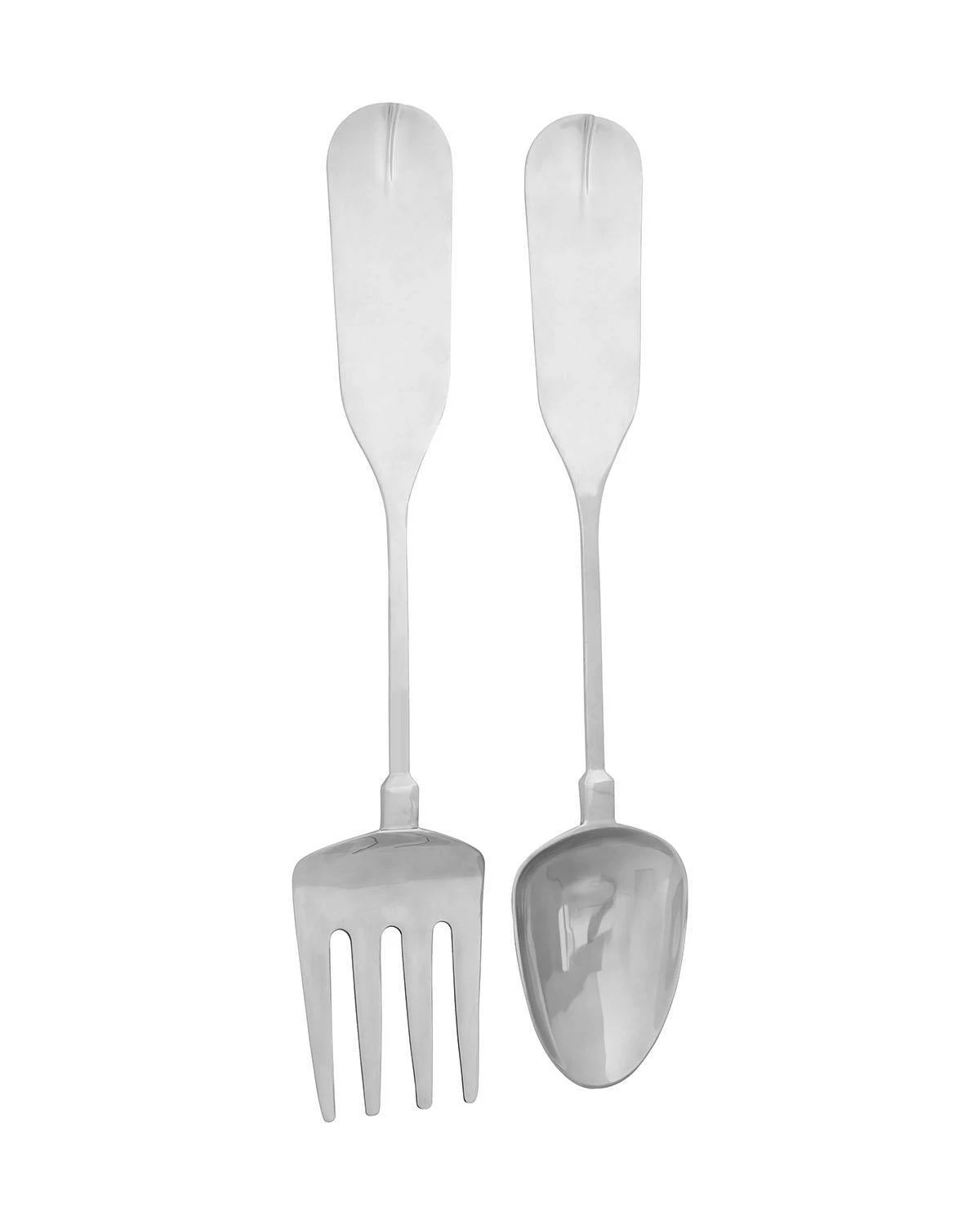 This fork and spoon set is crafted from robust aluminum and features a high gloss silver finish that enhances its glam appeal. The traditional design of each piece complements the metallic accent, making it a decorative addition to any space. Display it either upright or sideways with the hanging loops at the top and bottom.