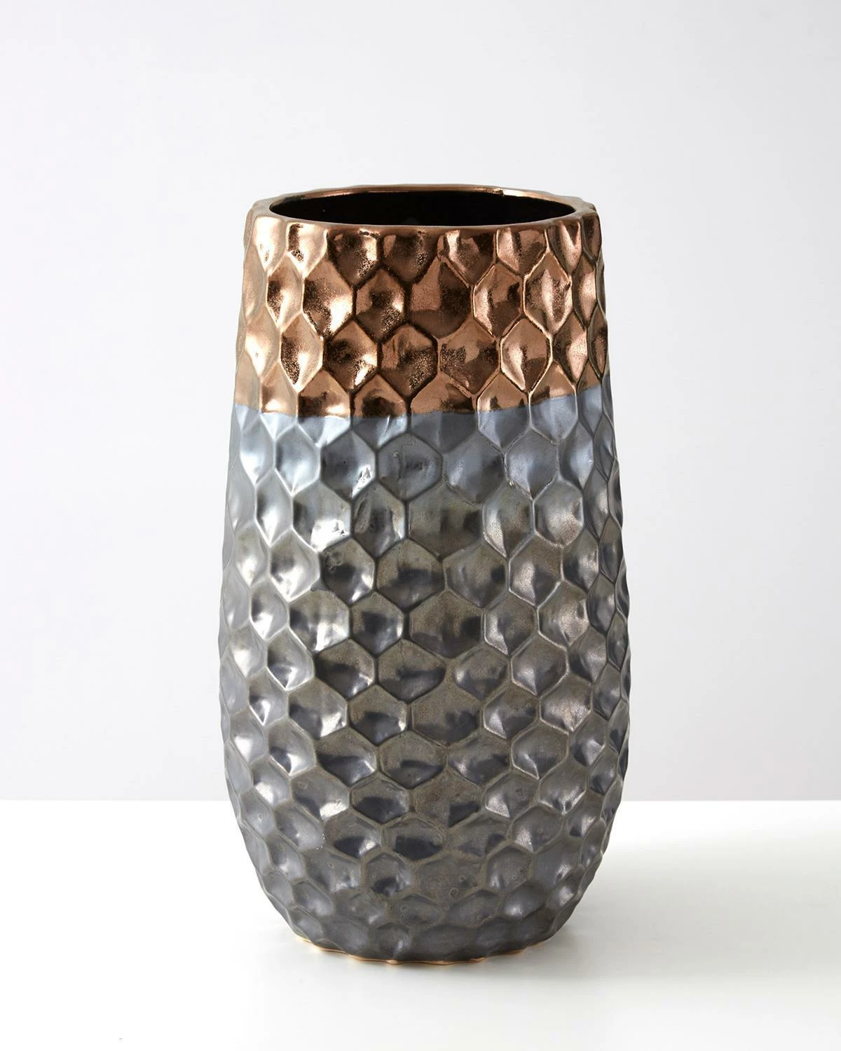 This vase is an exquisite porcelain piece that adds a luxurious geometric accent to shelves or mantels. Its honeycomb hexagon design is complemented by a gently rounded base that accentuates its slightly tapered lines. The silver and copper tones make it a stylish addition to any interior decor.