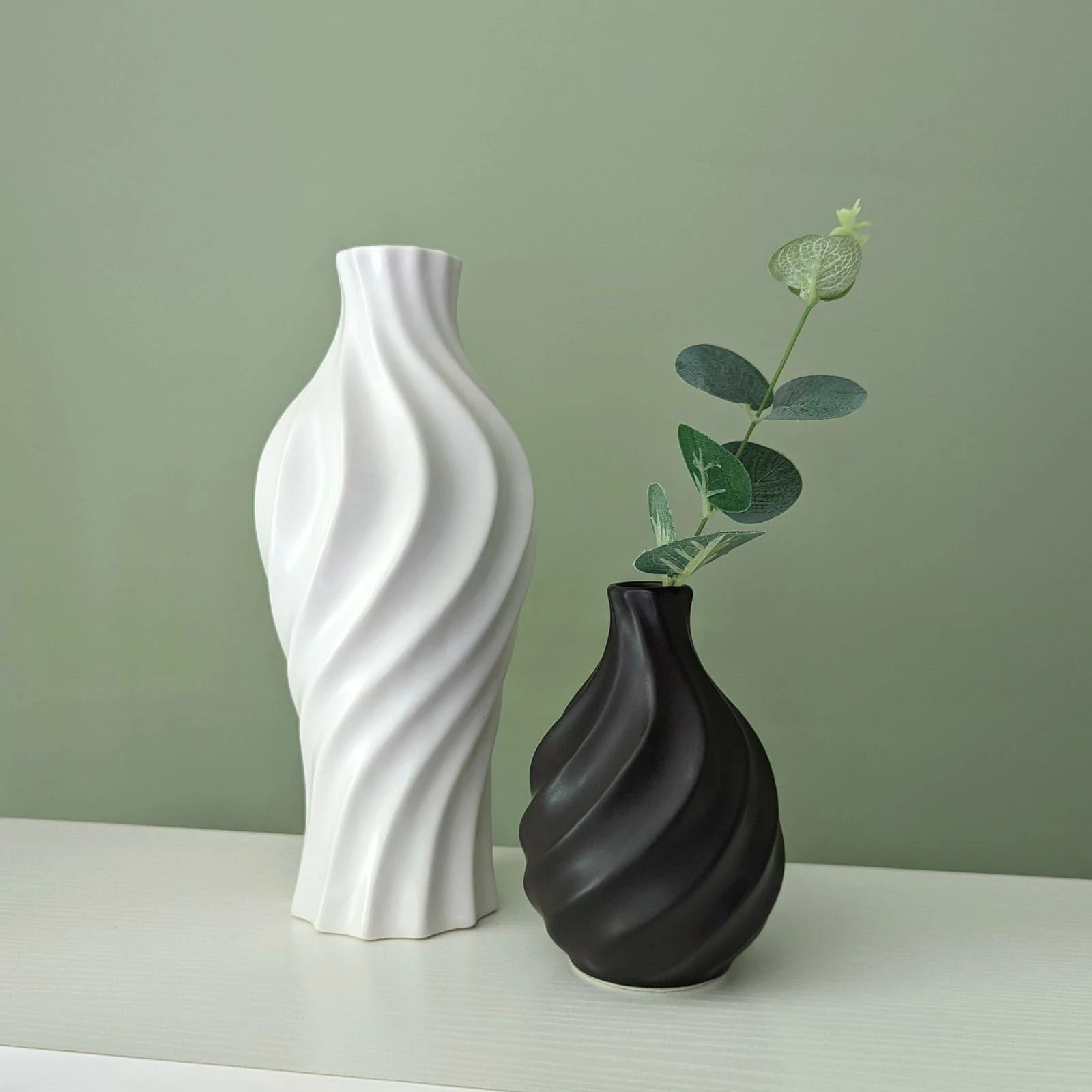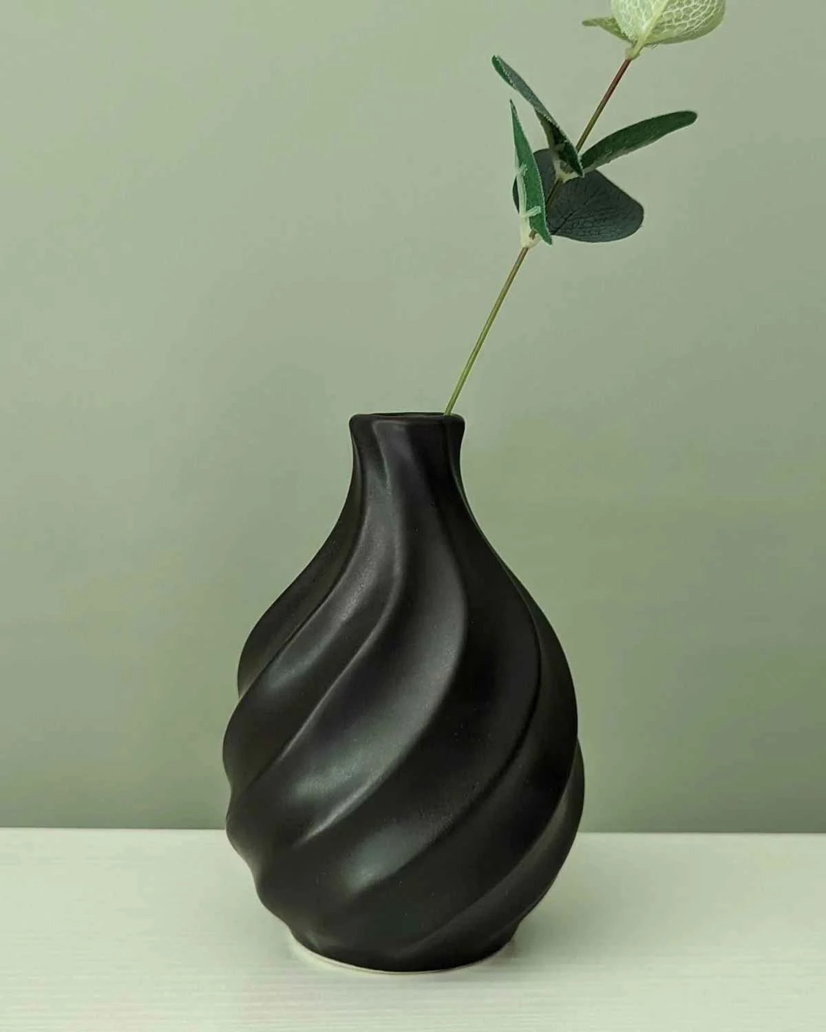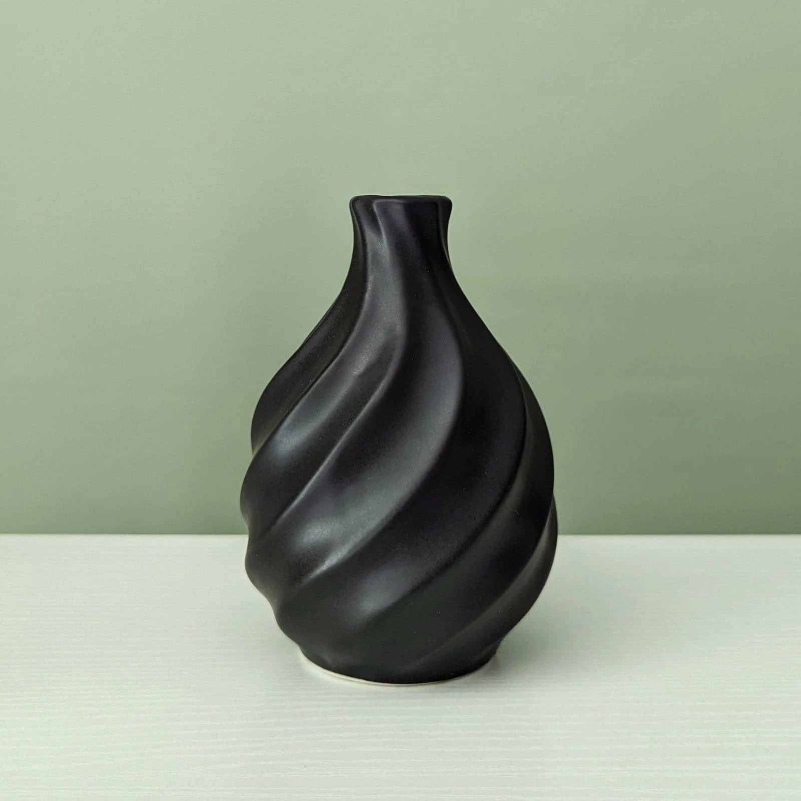 This small swirl bud vase offers shape and a contemporary finish to any room in your home. Ideal as a decorative feature or styled with a single spray, its classic matte black colourway makes for a striking finish. Part of our Silhouette collection, this can be mixed in with our co-ordinating items for a modern monochromatic feel.