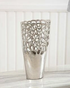 Bella is a modern and eye-catching piece that is sure to enhance any home decor. Measuring 39cm tall, this vase features a beautiful silver nickel metal finish with a unique cut out design that adds an extra touch of elegance and sophistication to the overall design. Whether displayed as a standalone decorative piece or used to hold artificial flowers or pampas, it is sure to make a statement in any room. Its unique cut-out design adds a touch of contemporary style and creates a stunning visual effect when placed in a well lit area.