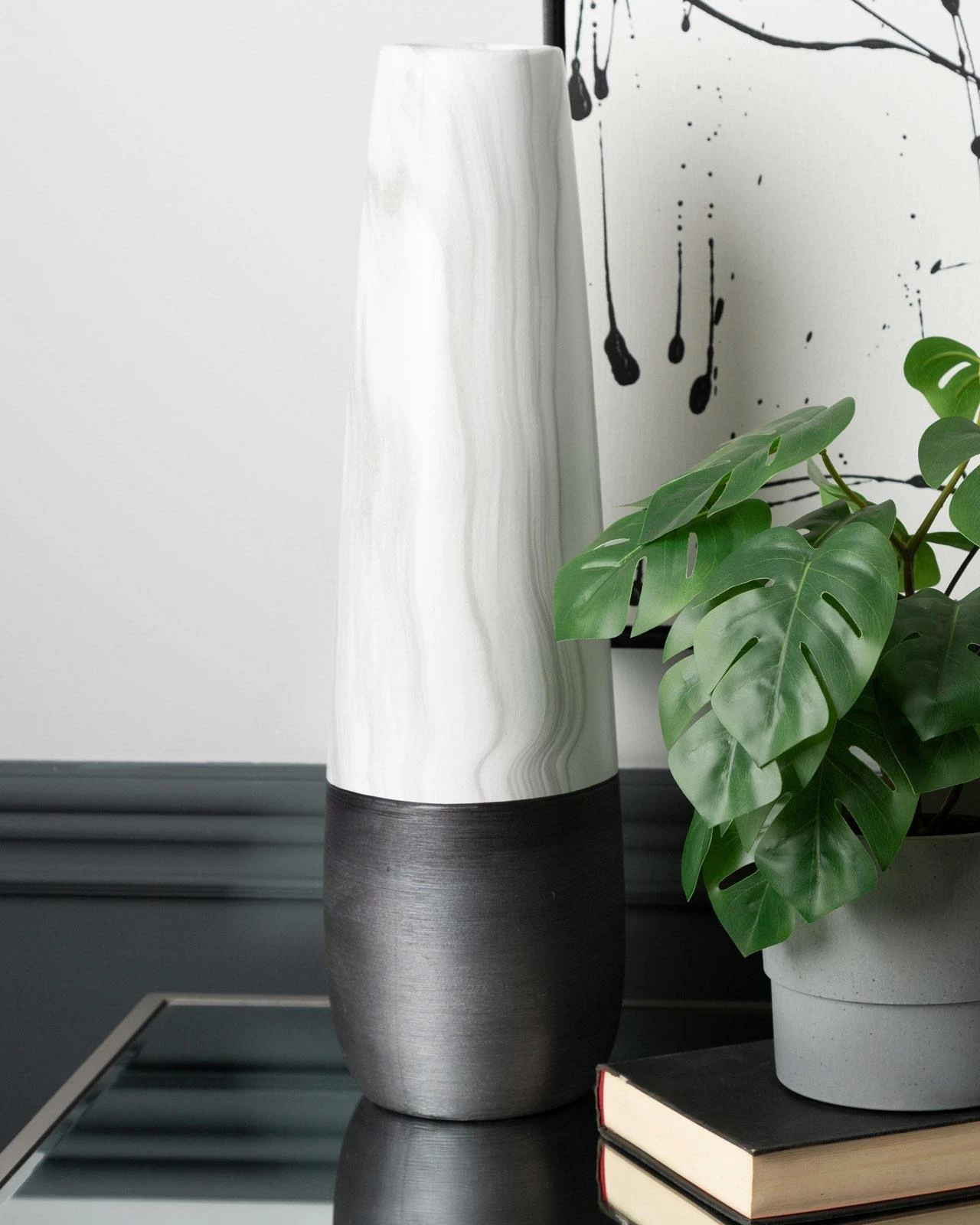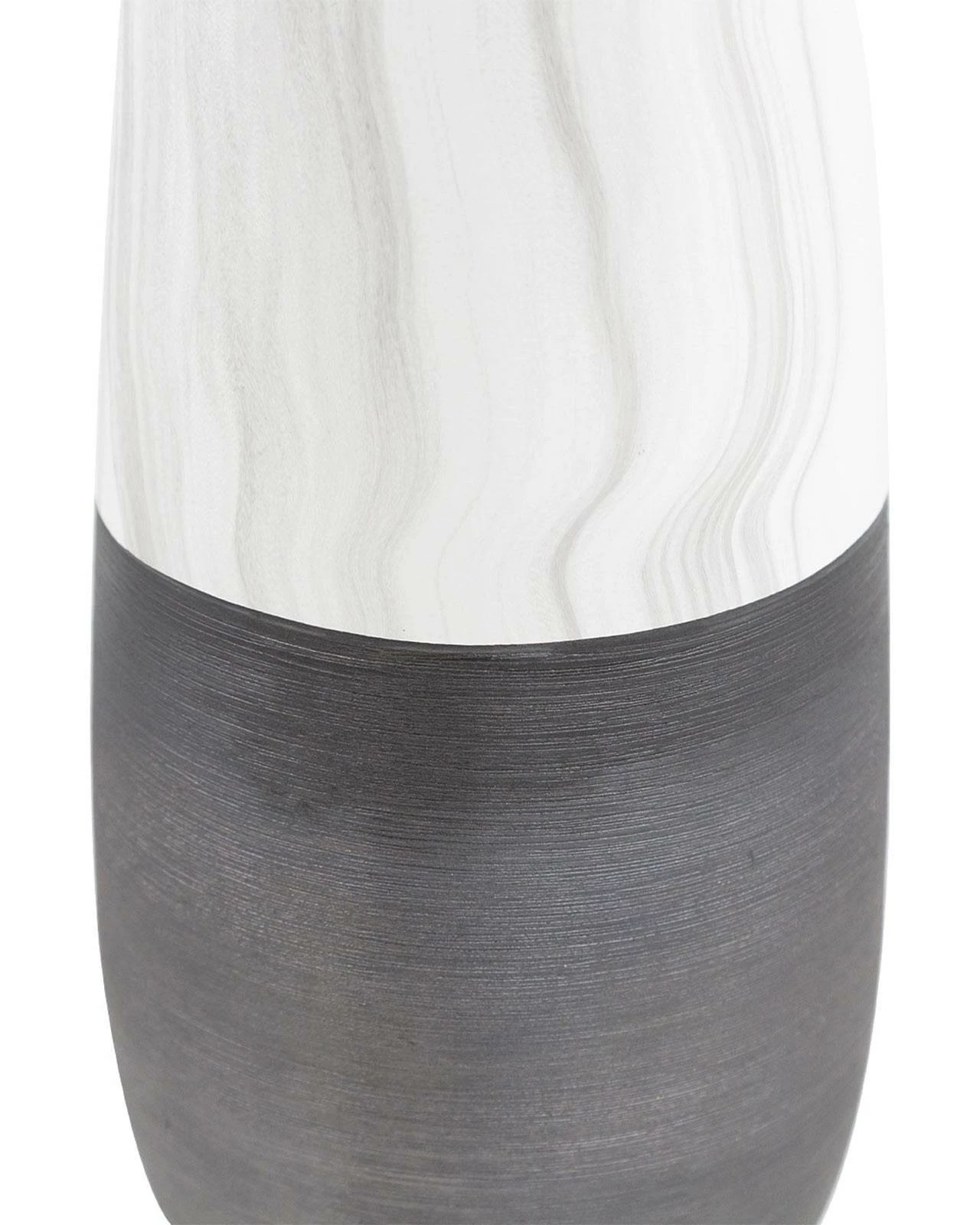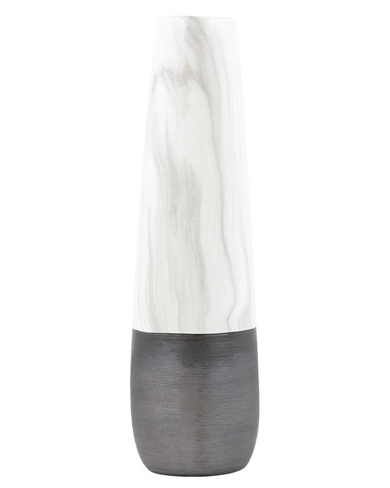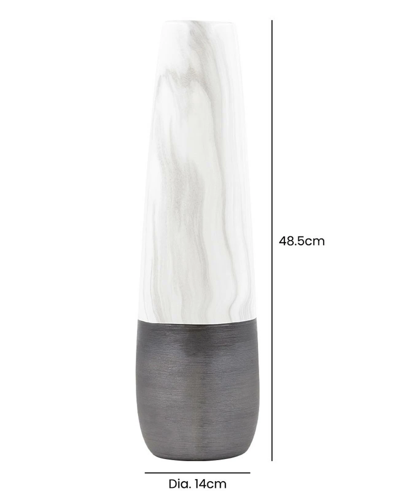 This Gaia vase is a versatile and stylish piece that will add a touch of sophistication to any interior decor. Measuring 48cm tall, it boasts a textured black base that is complemented by a timeless marble effect, creating a bold and elegant look. Whether displayed on a sideboard, end table or shelf, it is sure to make a statement. Its unique design and versatile colour combination make it a perfect choice for adding a touch of sophistication and elegance to any interior decor.