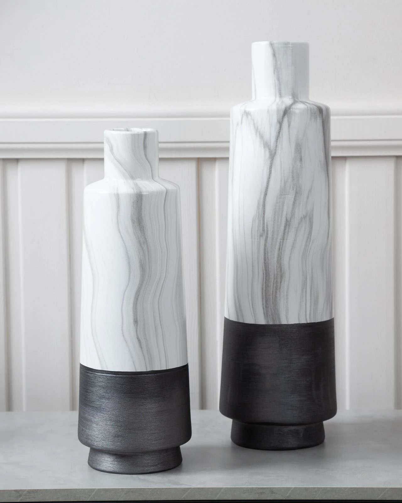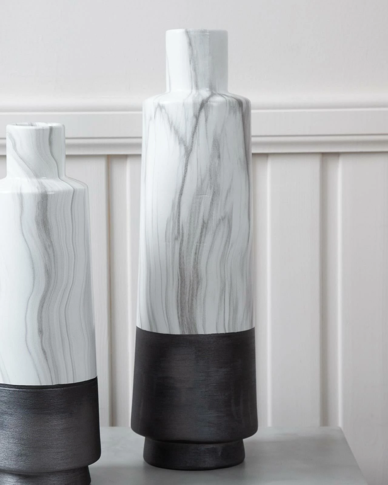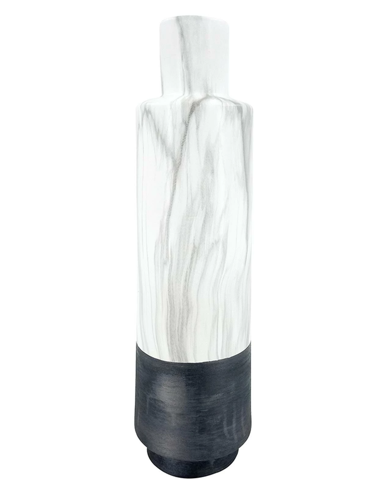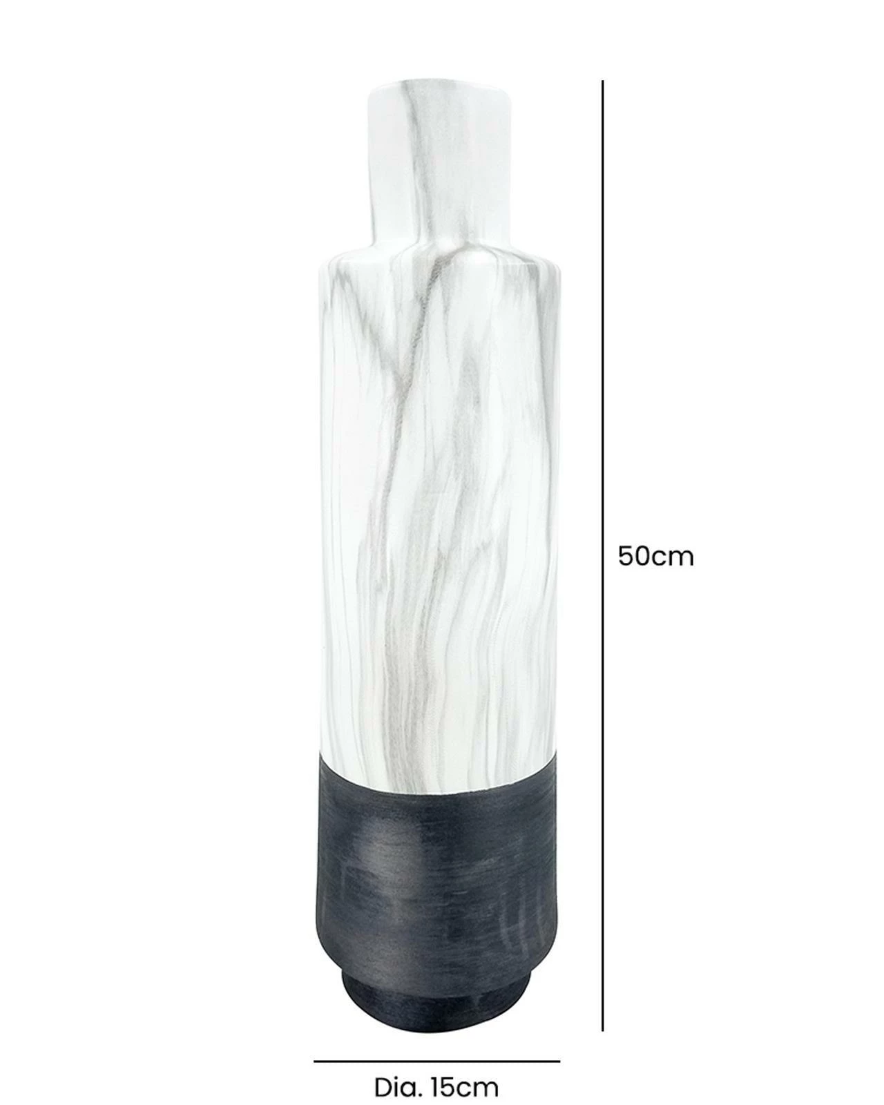 This Gaia vase is a versatile and stylish piece that will add a touch of sophistication to any interior decor. Measuring 50cm tall, it boasts a textured black base that is complemented by a timeless marble effect, creating a bold and elegant look. Whether displayed on a sideboard, end table or shelf, it is sure to make a statement. Its unique design and versatile colour combination make it a perfect choice for adding a touch of sophistication and elegance to any interior decor.