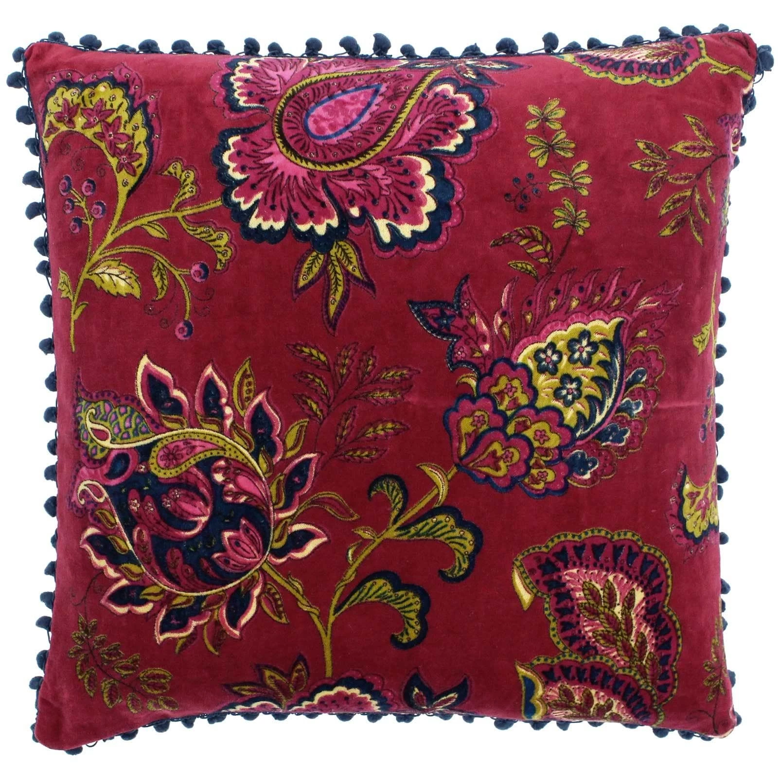 Made for the boho hippies found in all of us the Paoletti Malisa range brings together rich colours and sumptuous textures. The Malisa square cushion cover features a bright and detailed paisley Indian-inspired print of plants and flowers on a plain base that will bring a spark of botanical flair to any home interior. Featuring a faux velvet front and reverse these cushions are amazingly soft and will work fantastically on your sofa or bed. Each edge is embellished with contrasting pompoms adding to its character and a hidden zip closure stops anything from detracting from its unique design. This cushion cover has been lovingly made from 100% high-quality cotton giving it that notable cotton softness. Easy to care for this cushion is machine washable at 30 degrees. Use a warm iron and tumble dry on a low setting for the best finish.