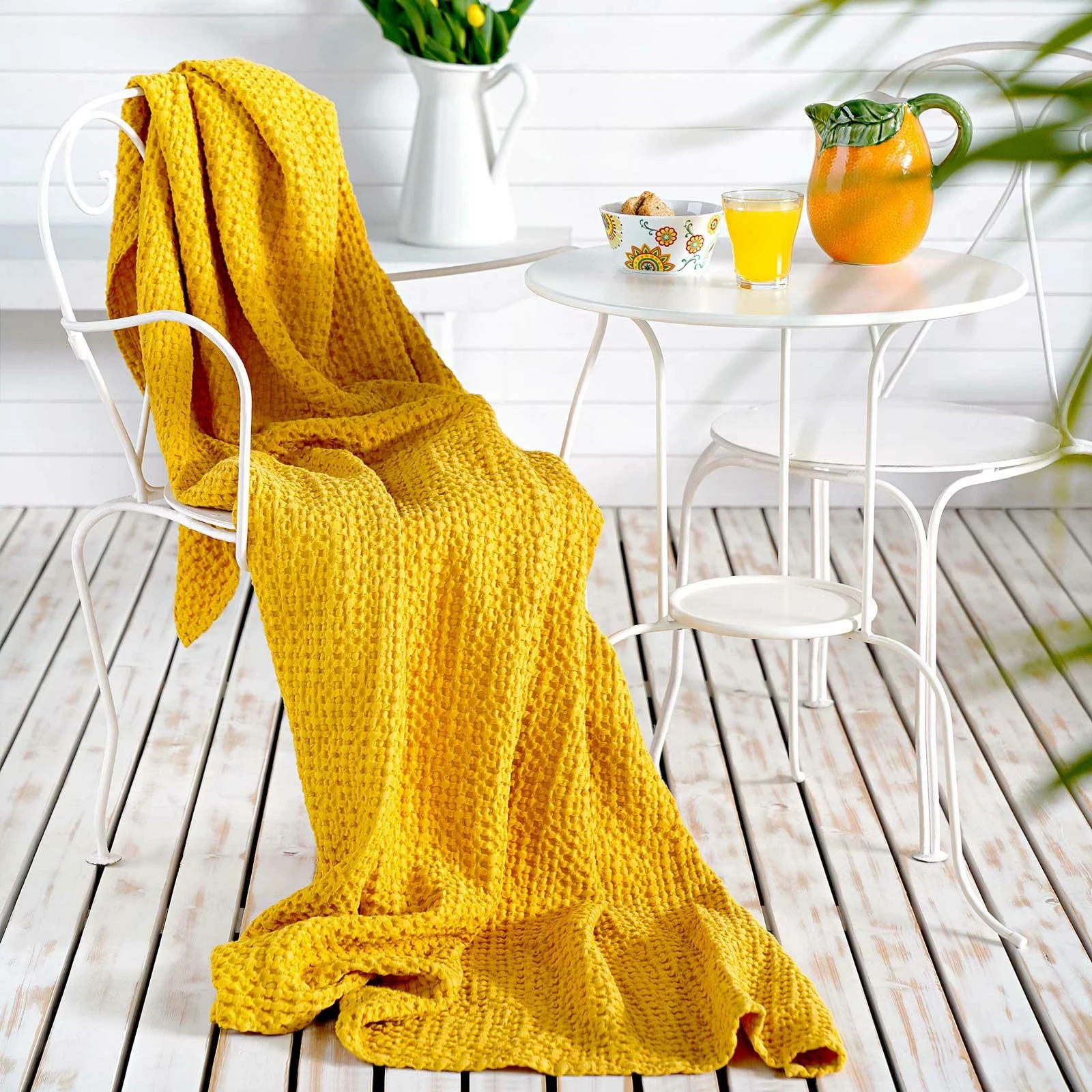 Cosy up with these wonderfully relaxed pure cotton throws woven in a waffle honeycomb design with a springy feel and a beautifully soft finish. A truly versatile piece for the bed or to use downstairs. Available in a vibrant yellow colour with a hem finish on all four sides.