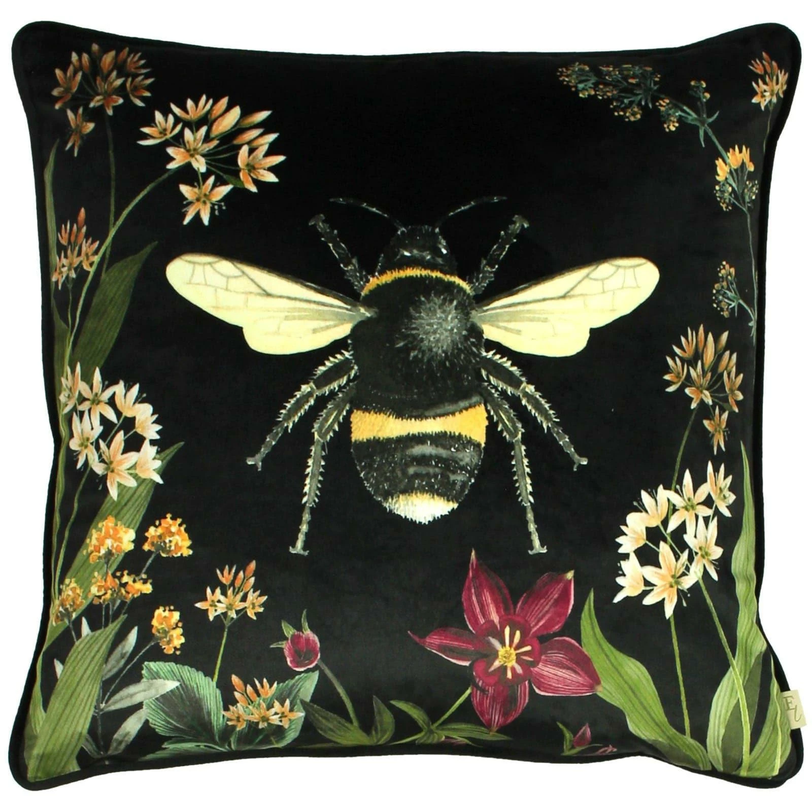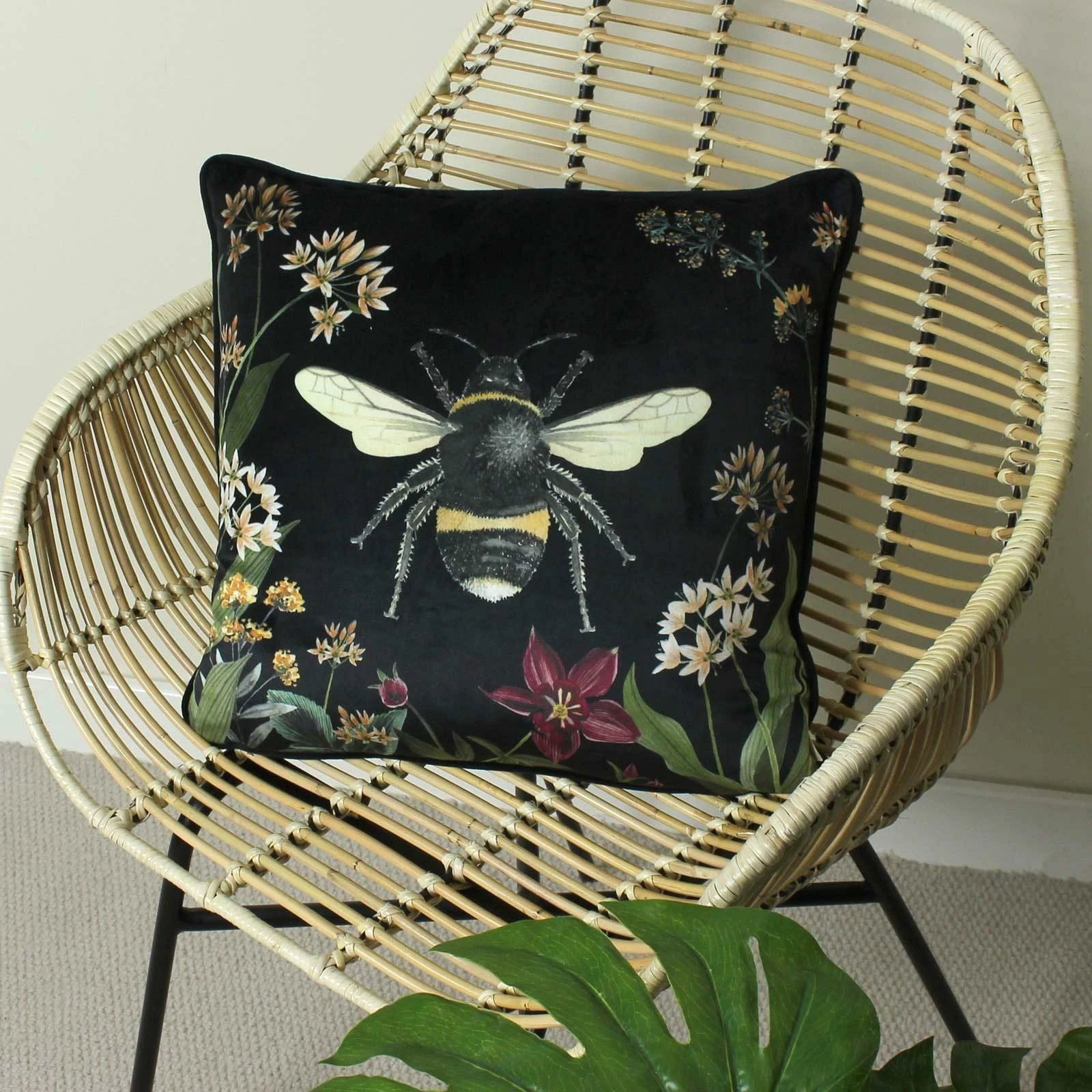 Create a striking display in your home with this Midnight Garden Bee cushion. Featuring the humble bee surrounded by bright foliage and plants, this design is not one to miss in any contemporary or modern home. Designed, printed and made in the UK.