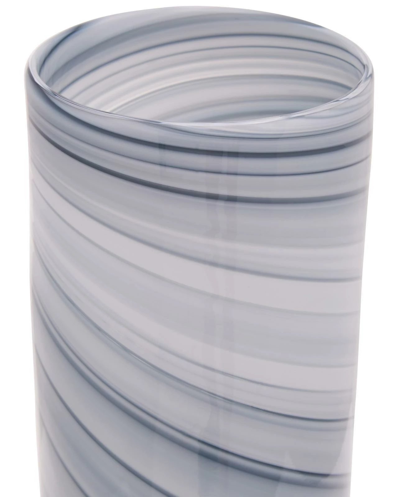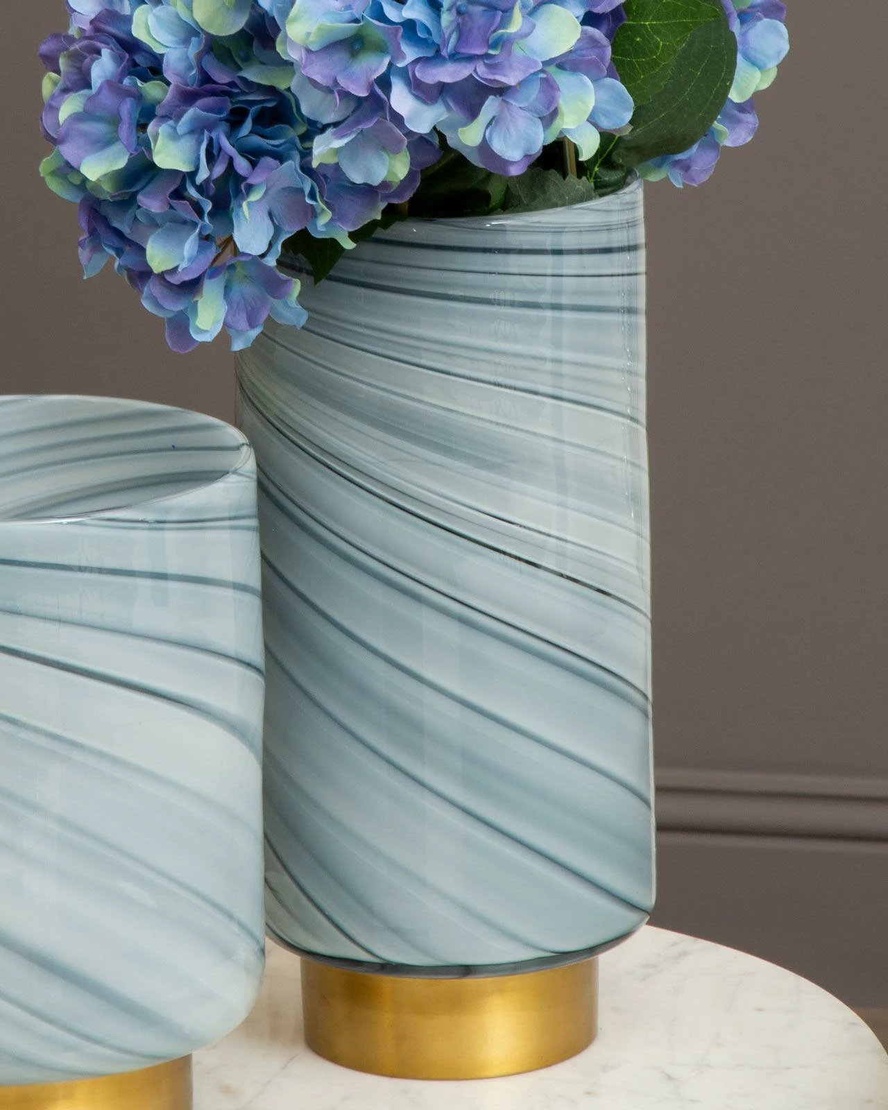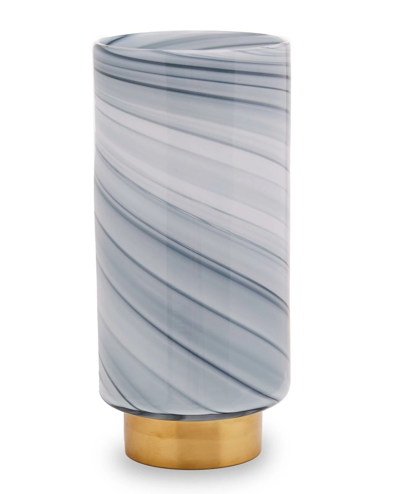 This Mira vase is a unique and stylish accent piece measuring 32cm crafted from striking grey glass that features a rippled effect. The sleek and modern design is elevated by the beautiful brass base, which adds a touch of luxury. Perfect for adding a touch of sophistication to your decor, this vase is a must-have for those who appreciate beautiful, high quality home accessories.