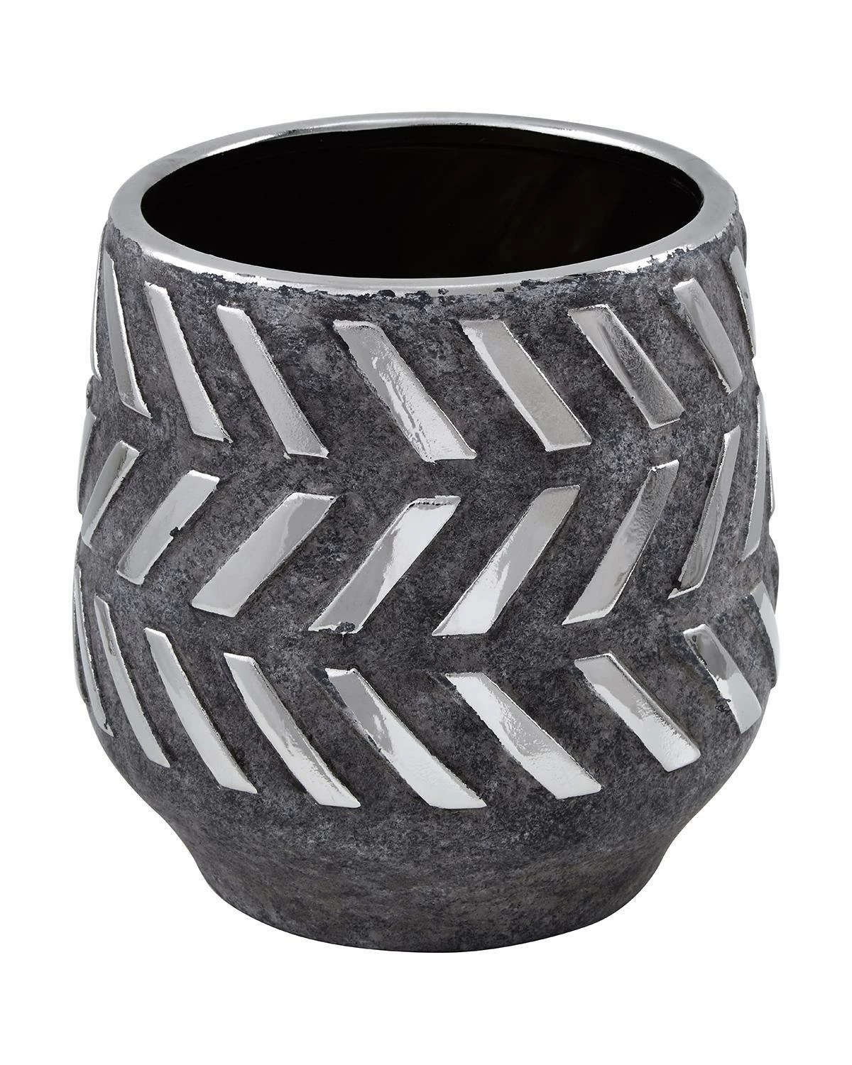 This beautiful barrel design ceramic planter is meticulously handcrafted by skilled artisans. It comes in a muted grey shade with geometric detailing, adding a touch of understated style to any room.