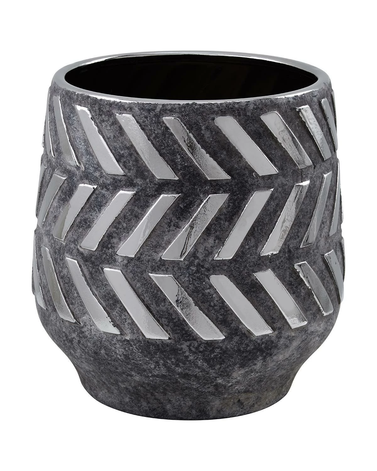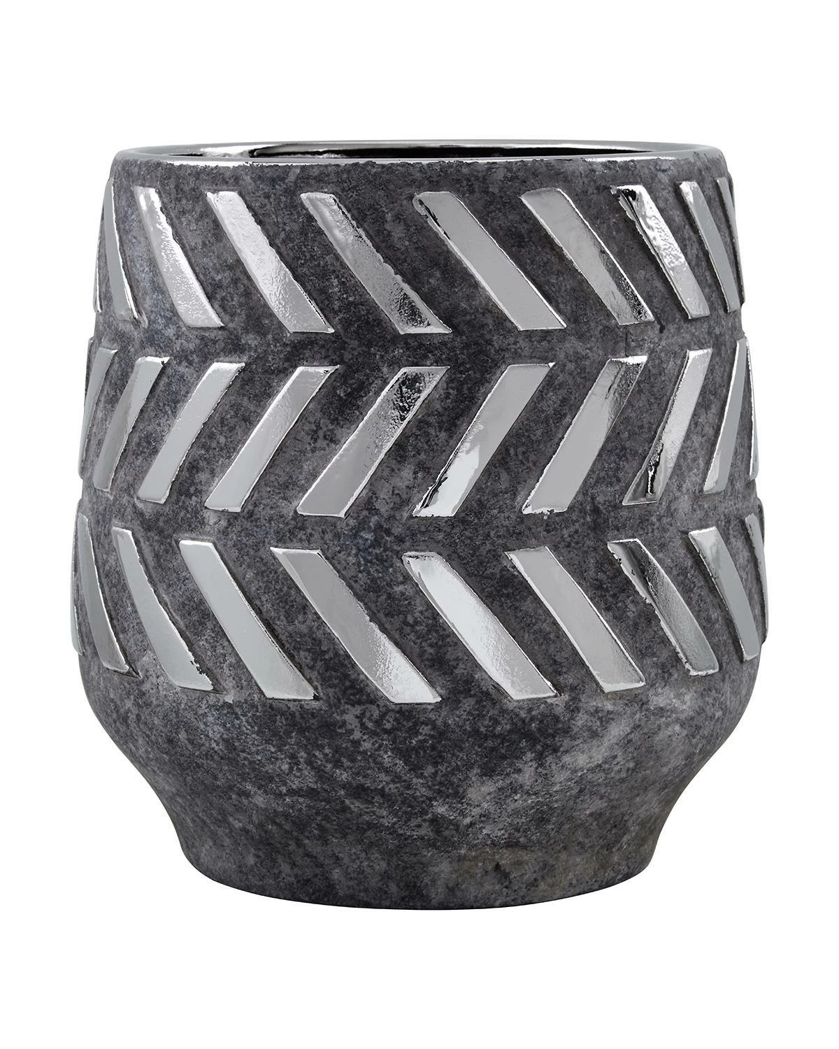 This beautiful barrel design ceramic planter is meticulously handcrafted by skilled artisans. It comes in a muted grey shade with geometric detailing, adding a touch of understated style to any room.