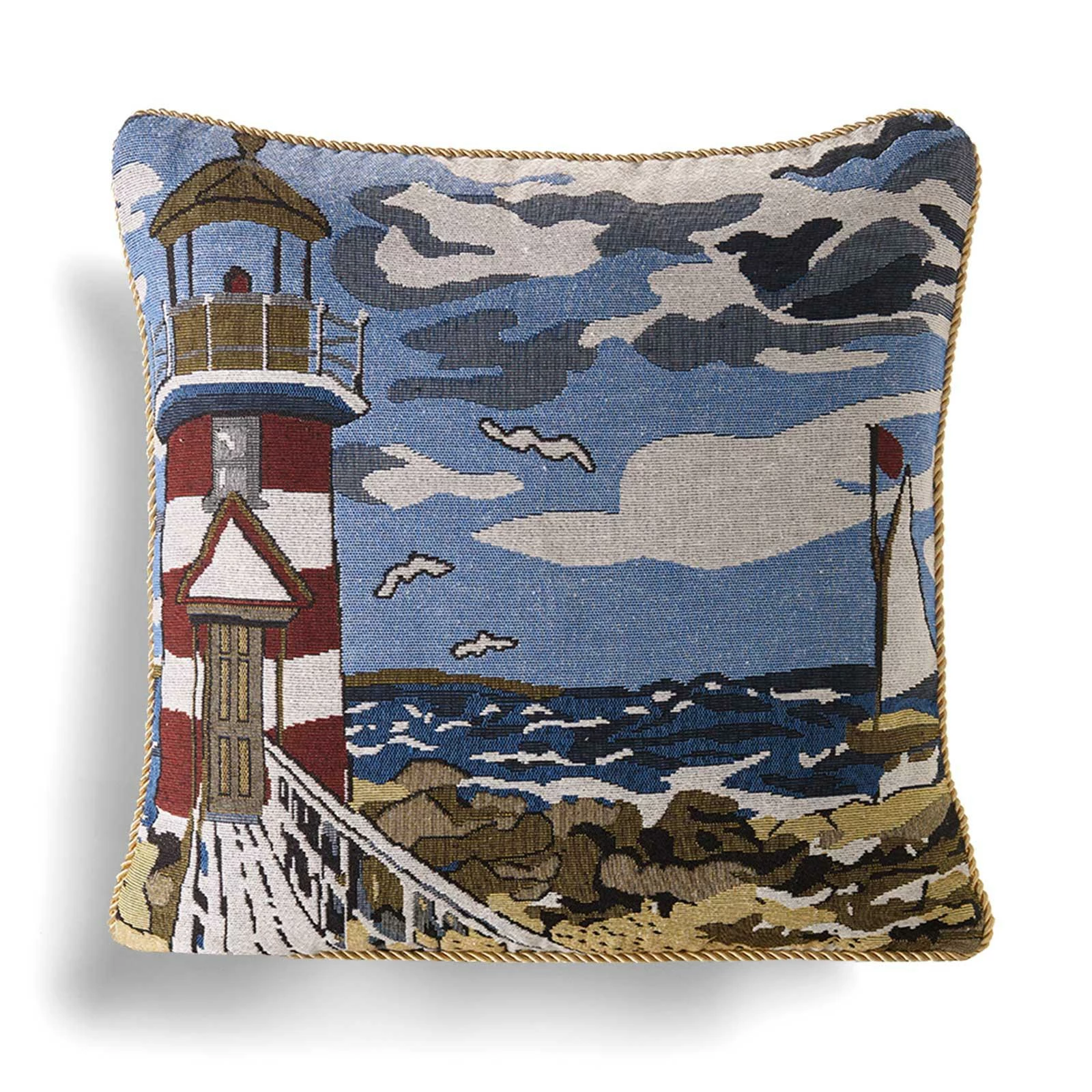 Stunning Seascape tapestry cushion cover featuring a vintage style lighthouse and beach scene design with matching rope piping trim and plain velvet reverse.