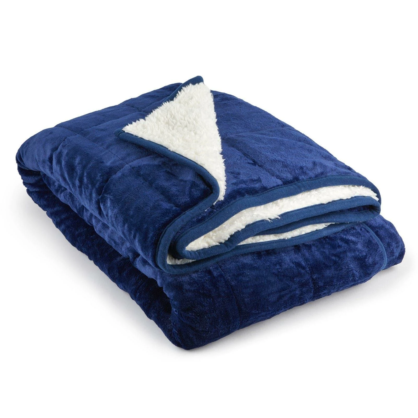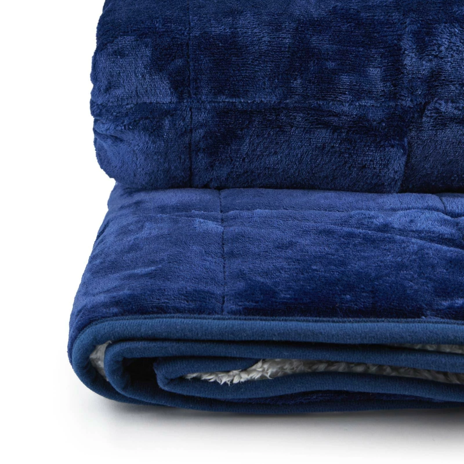 Warm, cosy and reassuringly comfortable you can use this blue weighted blanket on either the soft plush side for warmer days or have the fluffy sherpa side keep you extra snuggly. Studies show that a weighted blanket like this one can help you sleep for longer and more deeply with fewer interruptions waking you up feeling more refreshed. This blanket’s gentle all-over pressure mimics a subtle human hug, applying something called deep touch pressure therapy (DTP) to your body to keep you still and calm. This pressure increases the serotonin and dopamine levels in your brain, relaxing your nervous system to help reduce anxiety and stress. The blanket is specifically designed to fit your body, not to drape over your bed, so it can be used on any size.