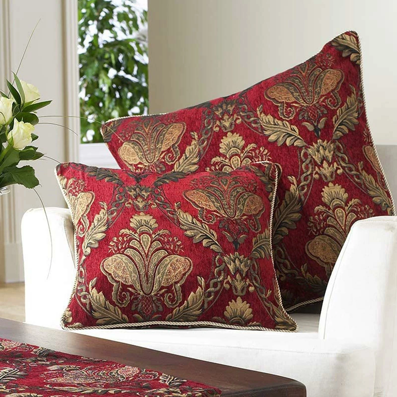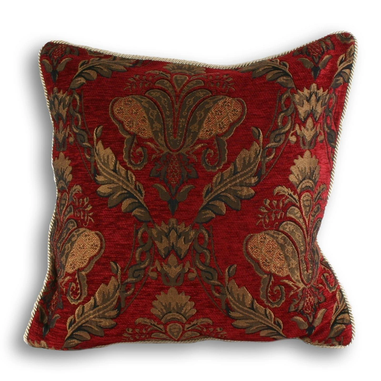 The Shiraz range is the height of opulence. Each piece has an embroidered damask pattern in delicate gold, presented on burgundy red, chenille-style fabric. The Shiraz cushion covers have a delicate twist piped edging in gold with a reversible design. The hidden zip closure ensures no attention is taken from the beautifully embroidered fabric. Although these lavish cushions are made of 100% hard-wearing polyester they will need extra care when cleaning and are therefore dry clean only.
