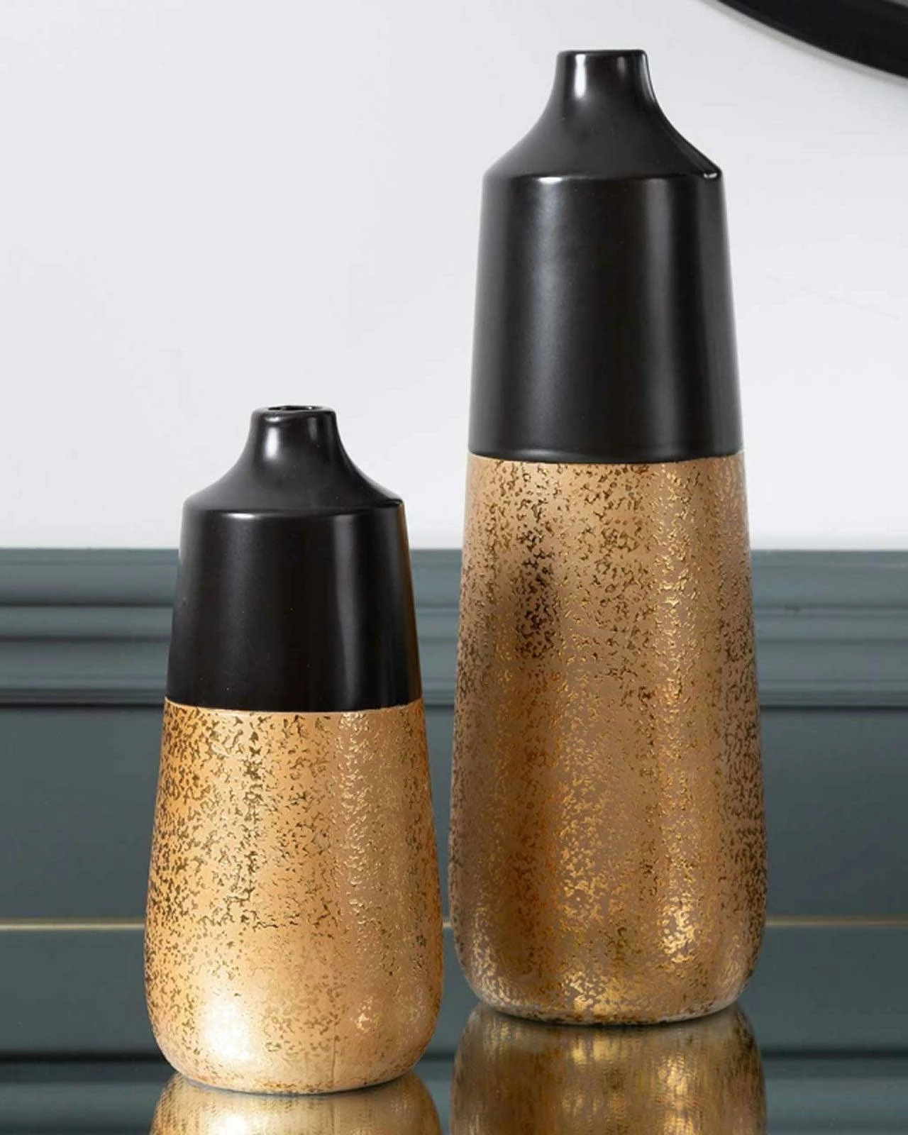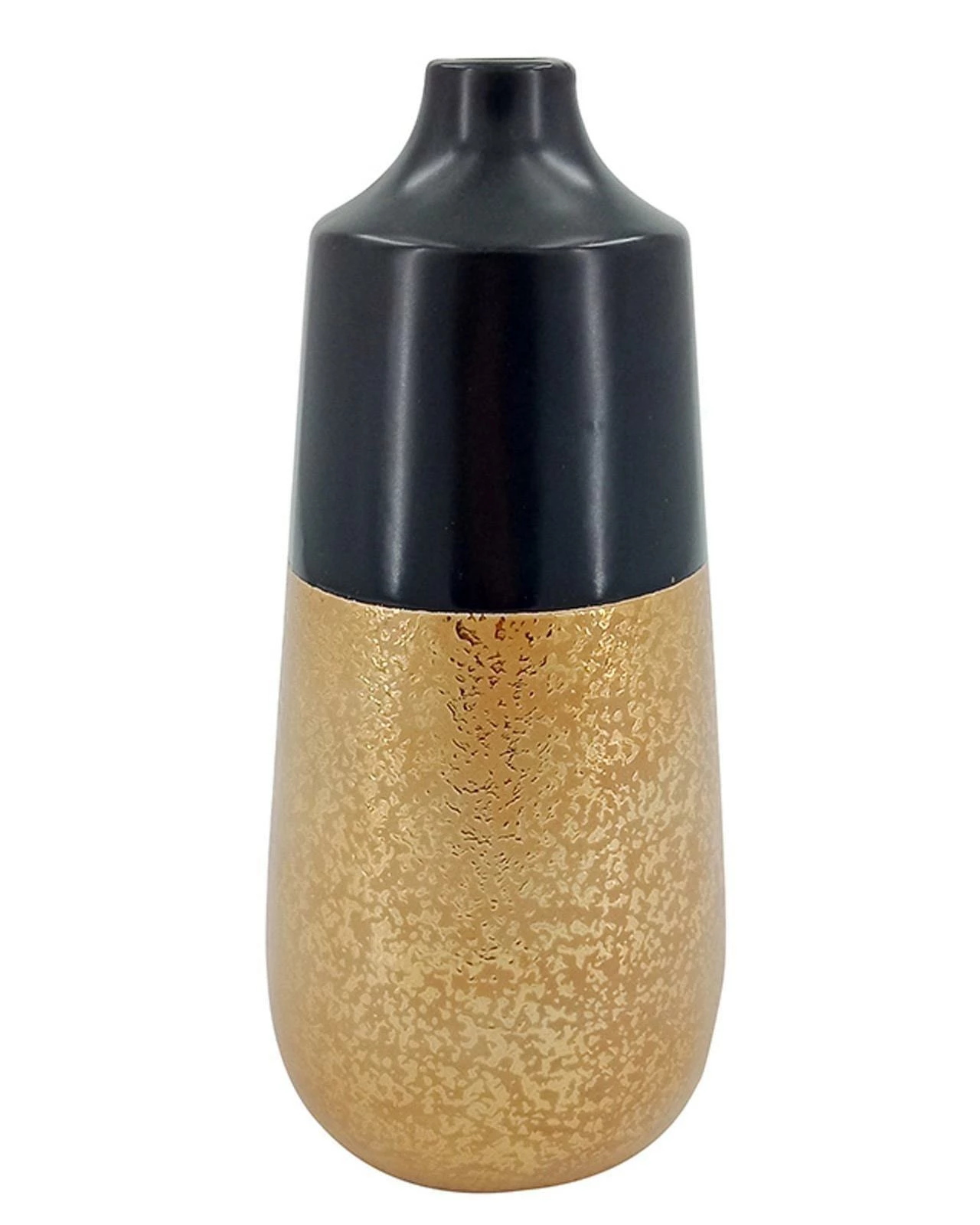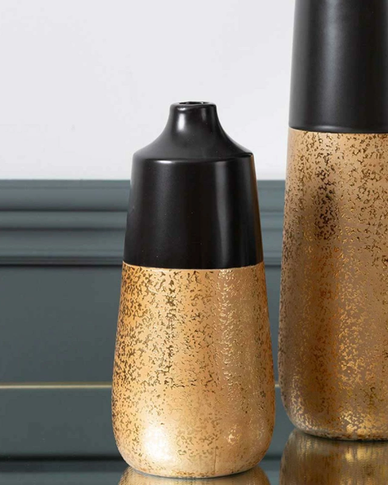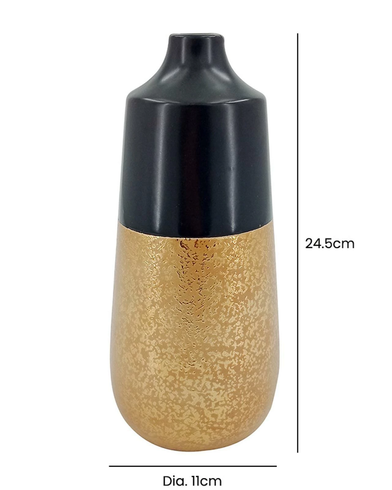 This Gaia vase is a sophisticated and elegant piece that will elevate the look of any interior with its opulence and on-trend colour. Measuring 24cm tall, this smaller vase boasts a uniquely shaped design that is both stylish and functional, while the beautiful black and gold textured design while the intricate details and stunning colour contrast create a bold and sophisticated look that will draw attention and compliments from all who see it. Whether displayed on a sideboard, end table or shelf, its unique design and sophisticated colour combination make it a perfect choice for adding a touch of opulence to any interior.