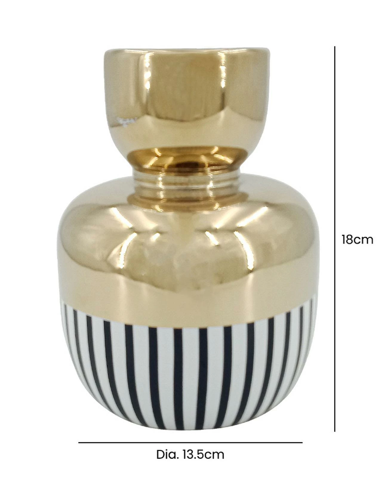 This Halley vase is a striking and unique piece that combines classic black and white stripes with the opulence of gold to add a fun and funky element to any decor. Measuring 18cm tall, this vase boasts a bold and eye-catching design that is sure to make a statement in any room. Whether displayed on a sideboard, end table or shelf, it is sure to draw attention and compliments. Its unique design and versatile colour combination make it a perfect choice for adding a touch of fun and personality to any interior decor. This vase is perfect for displaying your favourite blooms or simply as a standalone decorative piece. Don’t miss out on the opportunity to bring this stunning and unique vase into your home and enhance your decor collection with its bold and stylish presence.