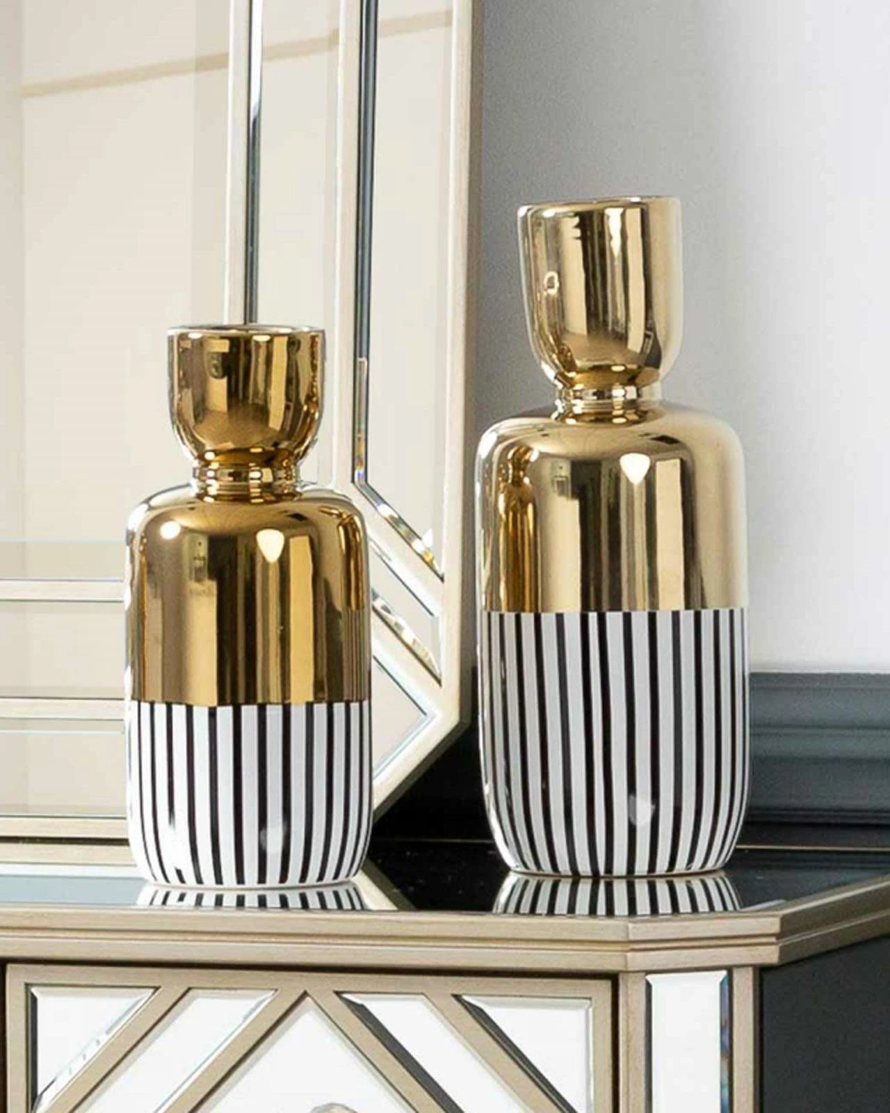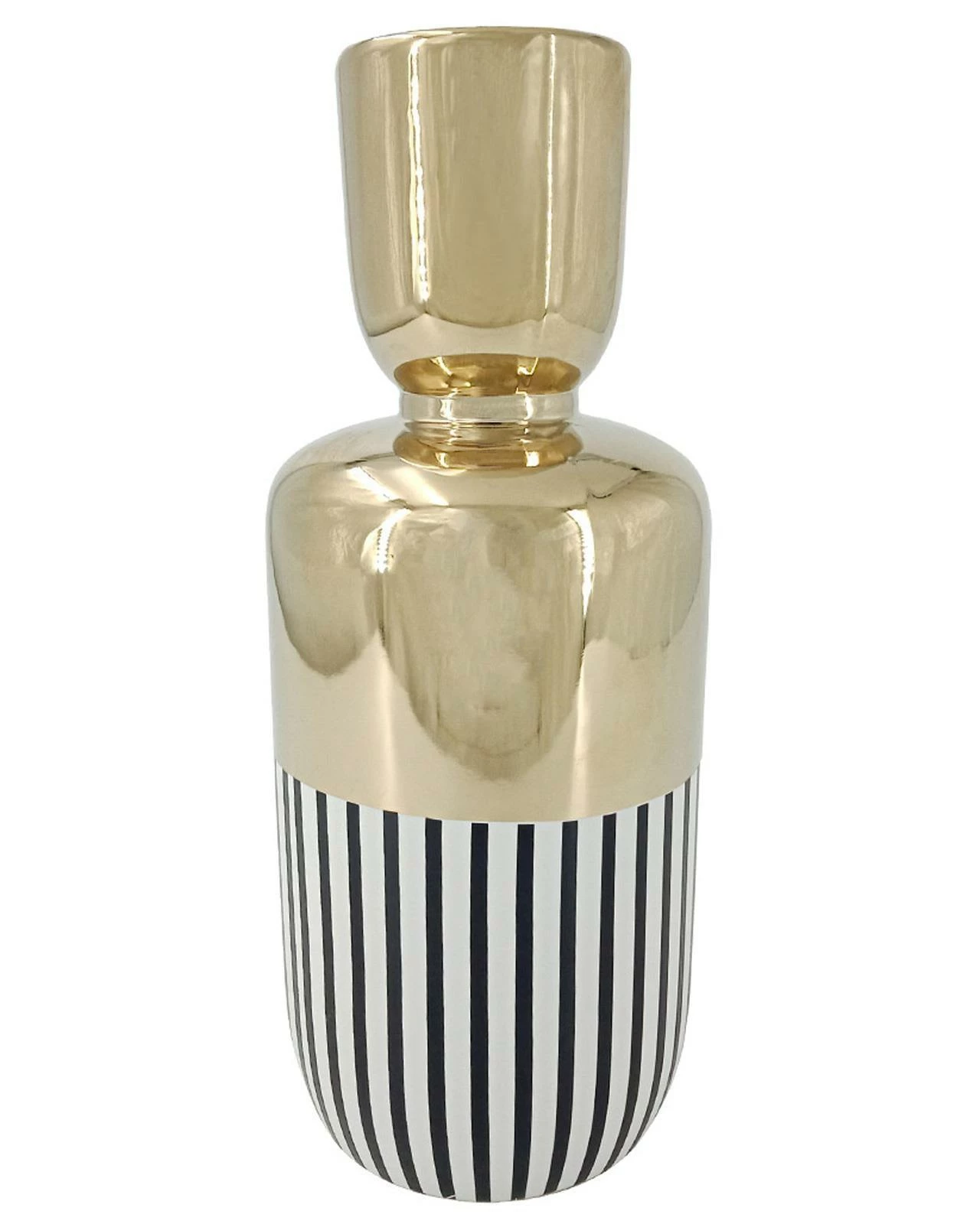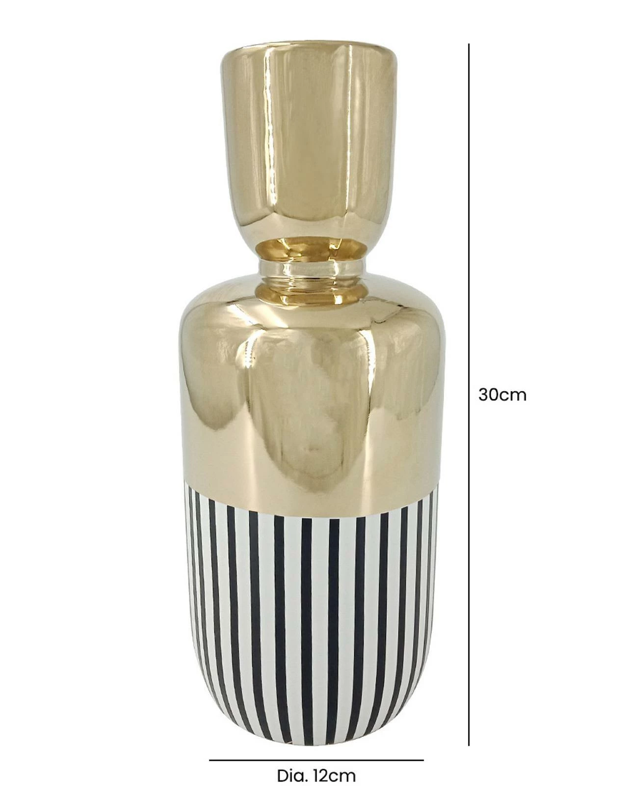 This Halley vase is a striking and unique piece that combines classic black and white stripes with the opulence of gold to add a fun and funky element to any decor. Measuring 30cm tall, this vase boasts a bold and eye-catching design that is sure to make a statement in any room. Whether displayed on a sideboard, end table or shelf, it is sure to draw attention and compliments. Its unique design and versatile colour combination make it a perfect choice for adding a touch of fun and personality to any interior decor. This vase is perfect for displaying your favourite blooms or simply as a standalone decorative piece. Don’t miss out on the opportunity to bring this stunning and unique vase into your home and enhance your decor collection with its bold and stylish presence.