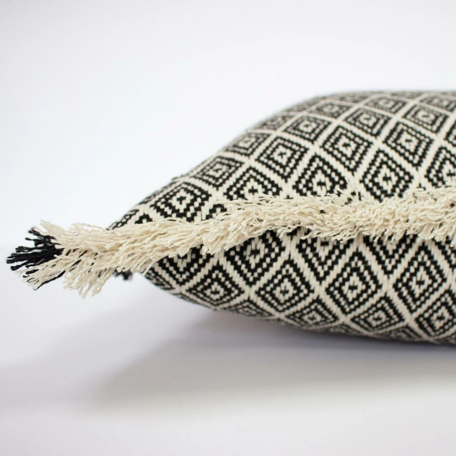 Add some texture and modern patterning to your interior with this Tangier cushion cover. Featuring a fringe trim edging, this rectangular cushion would look excellent layered up in neutral toned decor.