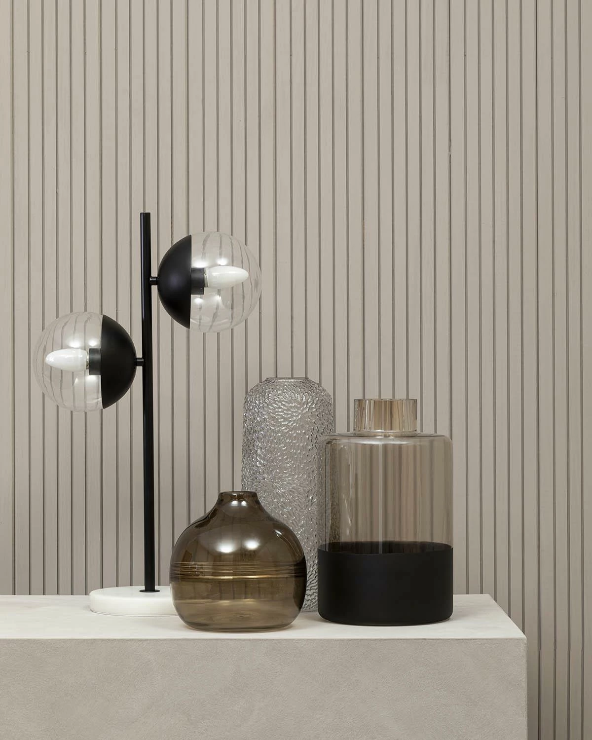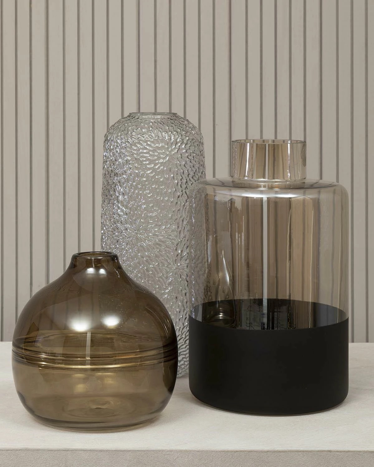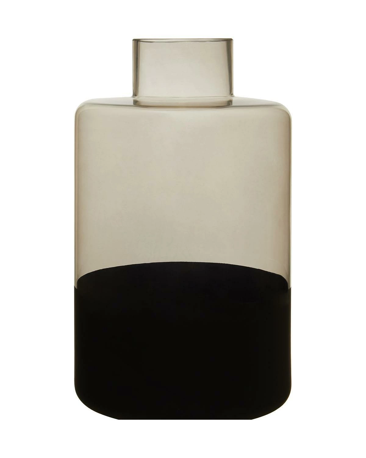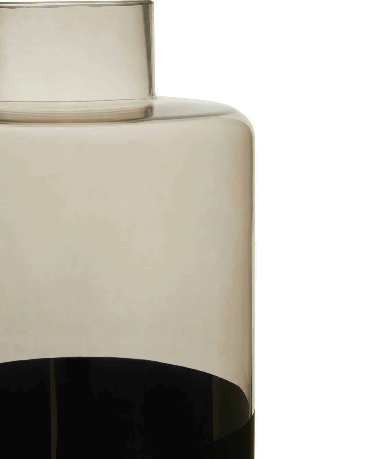 This contemporary bottle vase is made from clear glass with a smoked top that creates a shaded effect. Set against the black base, it forms a striking two-tonal contrast. Its narrow bottleneck and clean-lined base complete the minimal design aesthetic. Style and pair it with the large Cova bottle vase for coordination.