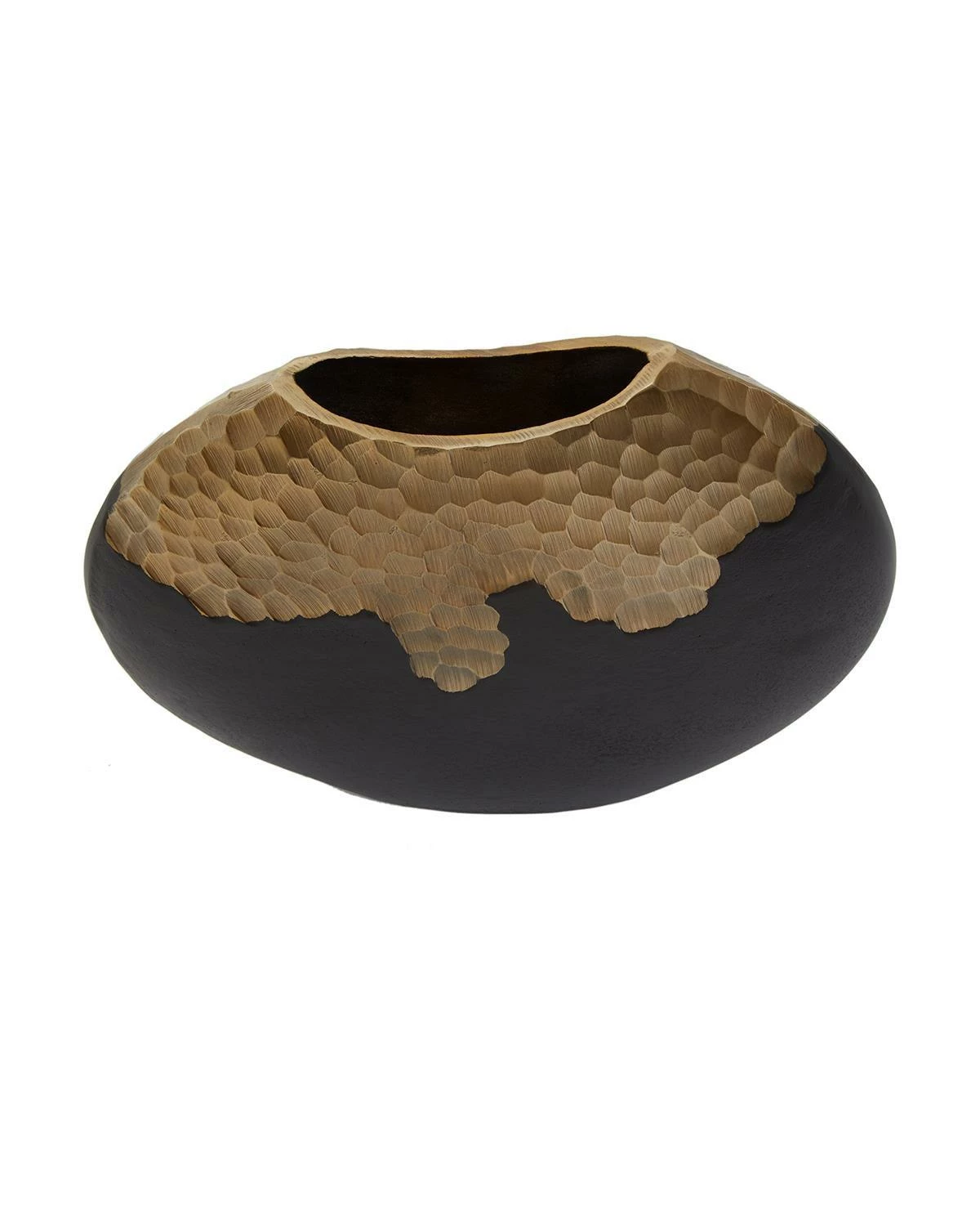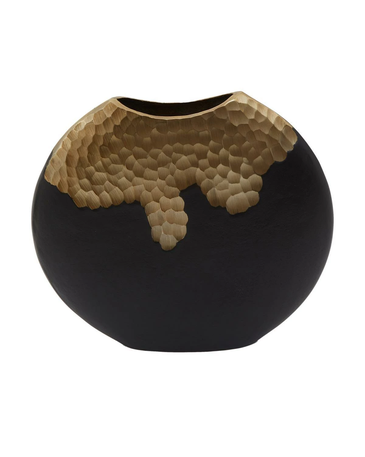 The round vase combines warm metallic and black finishes with textured effects to create a striking focal point in the living room. This small vase is well-suited to mid-century modern and urban-inspired interiors.