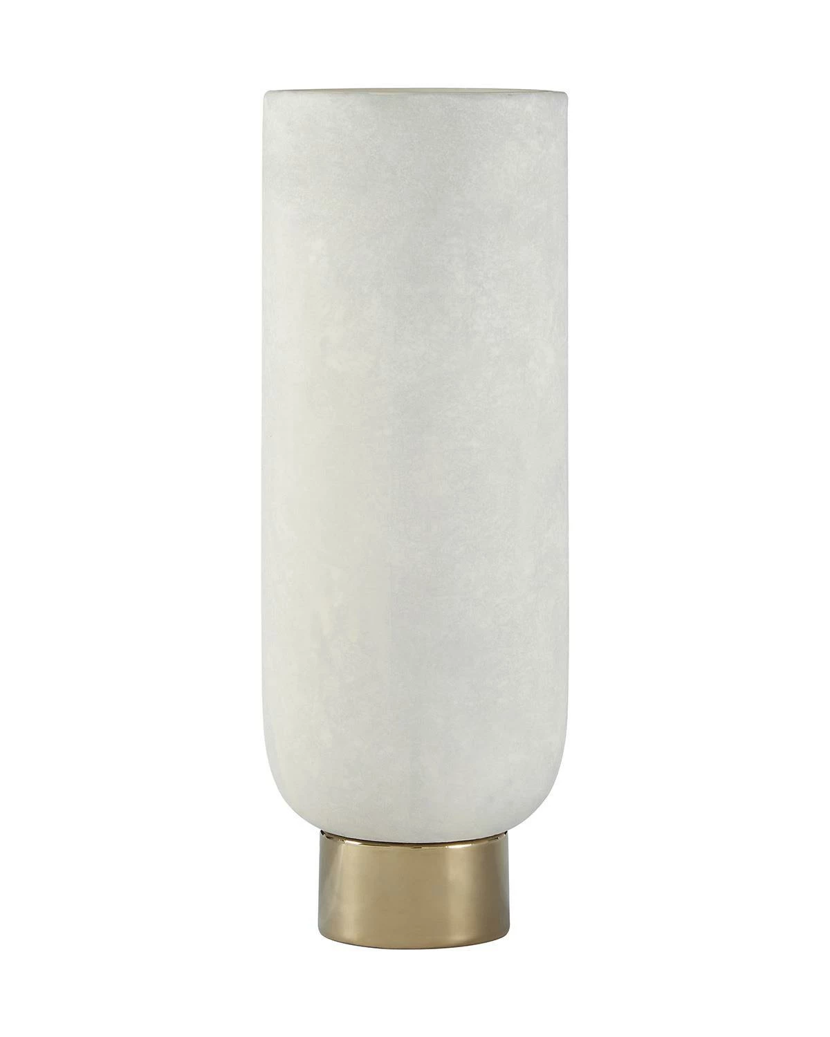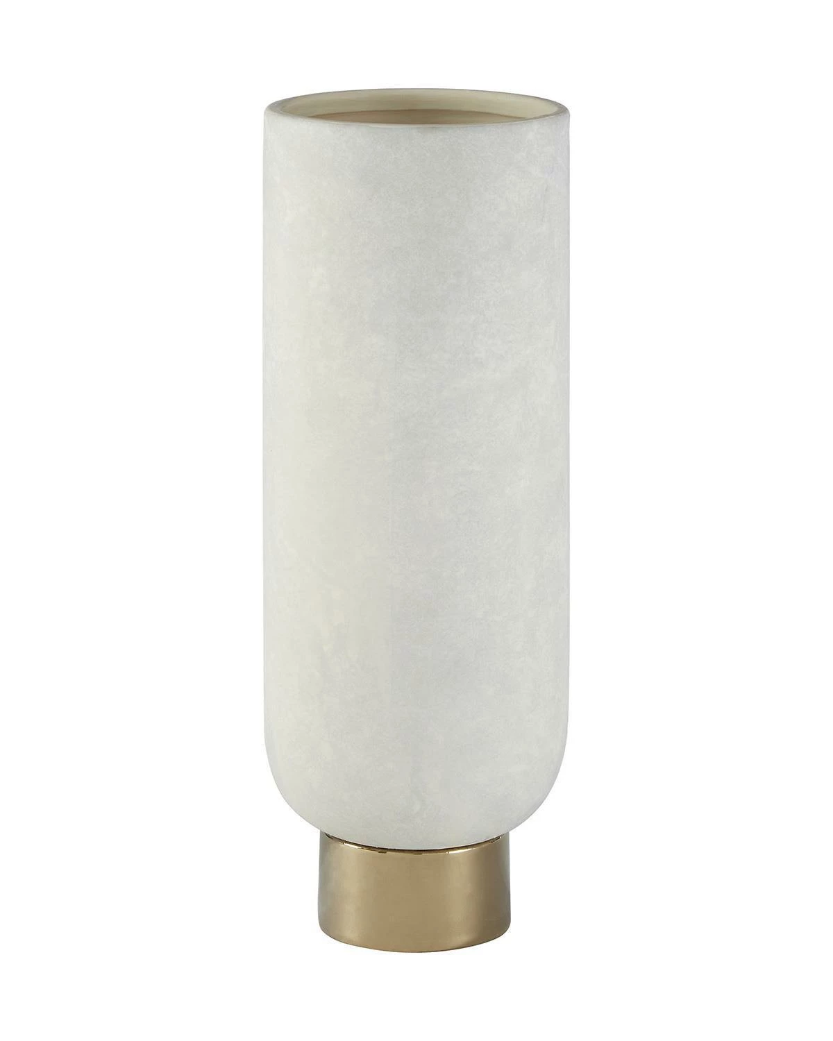 This small vase is crafted from robust stoneware and has a white and neutral hue across its cylindrical structure. The sturdy round base in the warm metallic finish subtly enriches the visual appeal of this versatile vase.