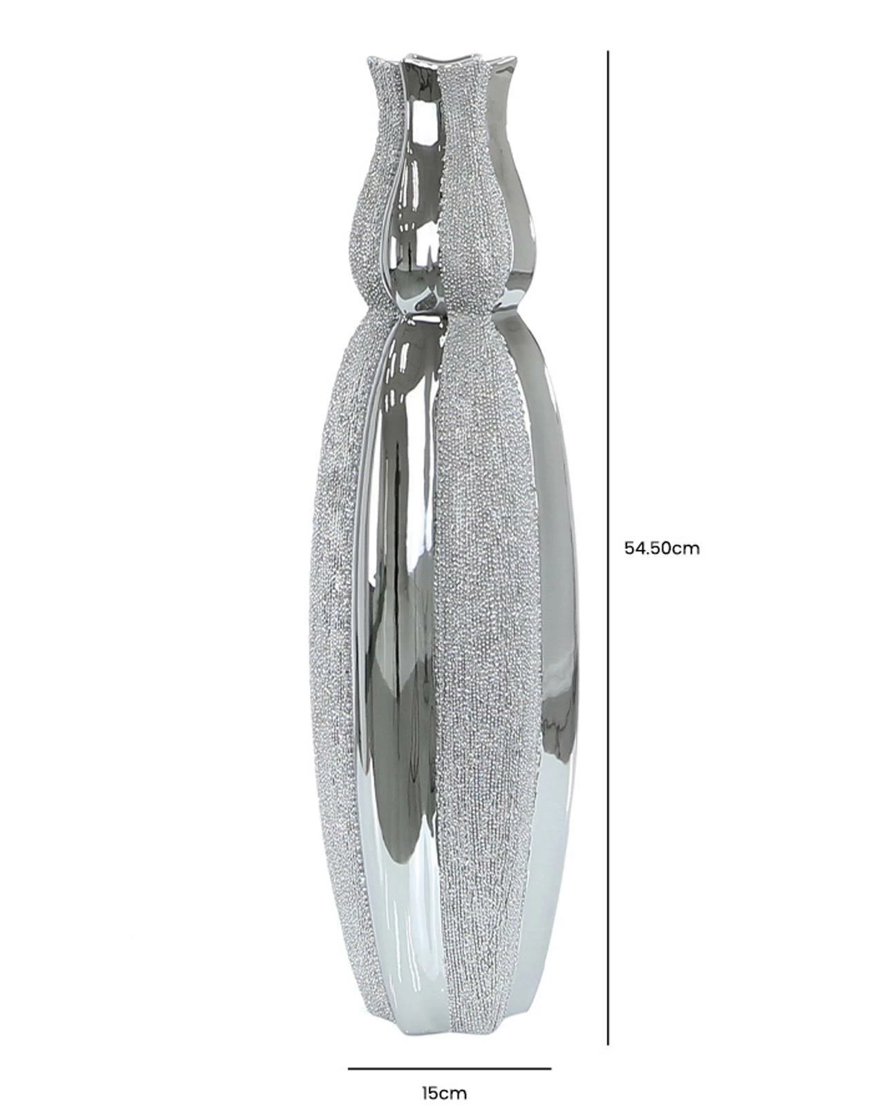 This Zahira vase is a stunning addition to any modern home decor. Measuring 54cm tall, it boasts a unique design featuring a wave effect that runs along every other face of the vase, creating a textured and dynamic look. The wave effect culminates in a beautiful star shaped opening at the top, making it the perfect vessel for displaying flowers and greenery. Crafted from ceramic, this vase is finished in a sleek silver colour that gives it a modern and sophisticated look and its textured surface adds depth and dimension to the vase, making it a standout piece that will draw attention and compliments from all who see it. Perfect for adding a touch of contemporary elegance to any room in your home, use it to showcase your favourite blooms or simply display it as a stunning decorative piece on its own.